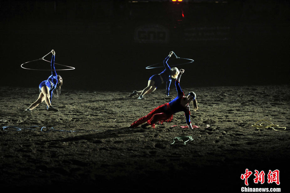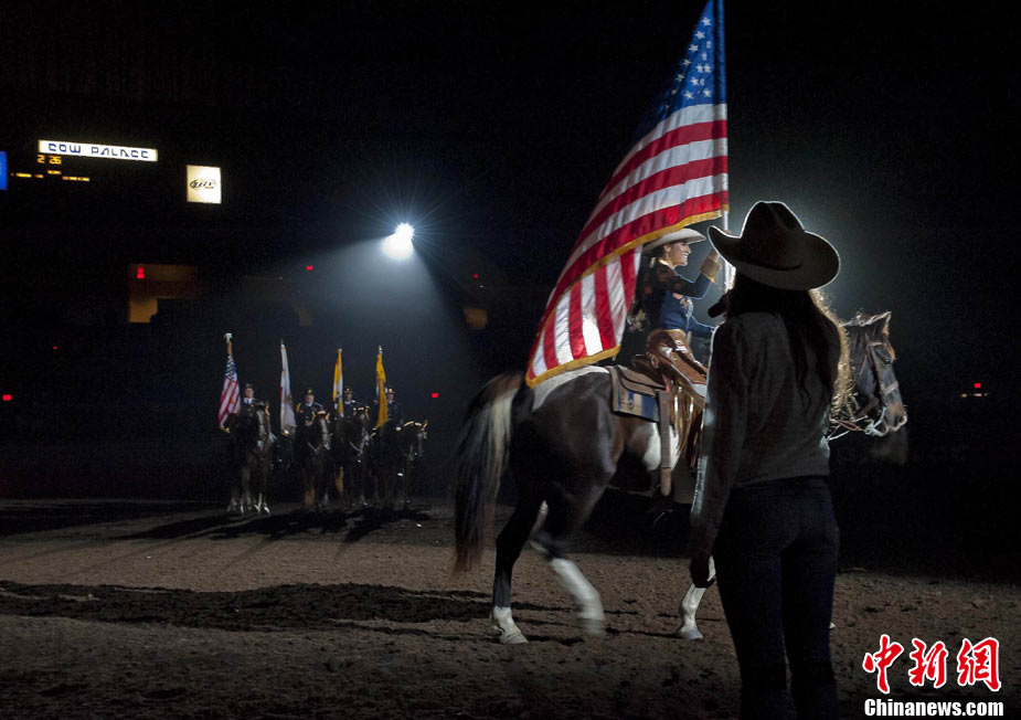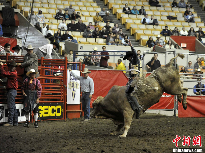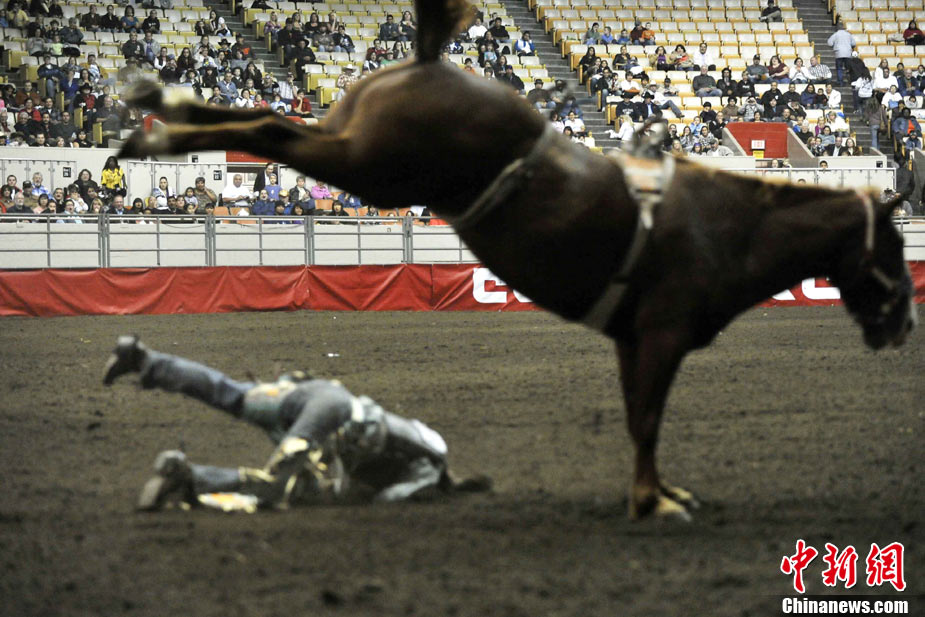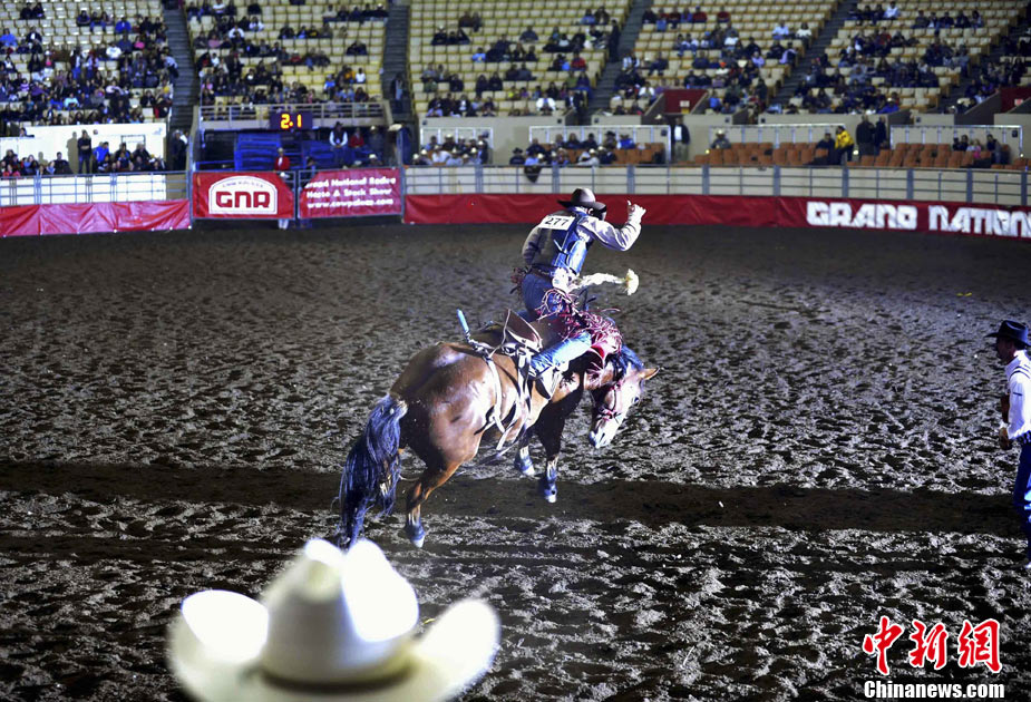 為期四日的全美騎術大會在舊金山的牛宮(Cow Palace)舉行。來自全美多個州的專業(yè)和草根牛仔參加表演,舉辦者預測將會吸引兩萬名左右的觀眾前來參觀。舊金山的全美騎術大會始于1941年,是全美專業(yè)騎術大會的前奏。圖為一名牛仔在努力馴服烈馬。中新社發(fā) 陳鋼 攝