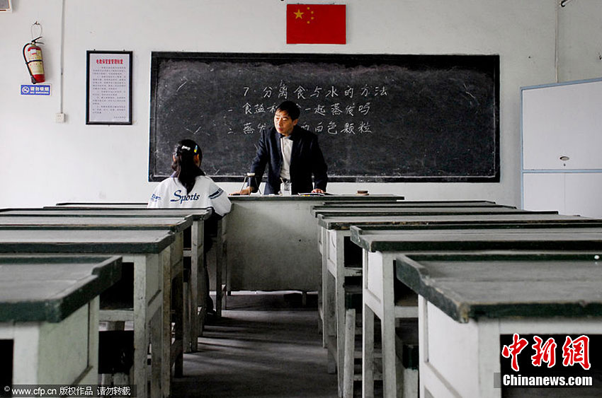 成都郫縣清水小學(xué)搬遷前夕,一位學(xué)生因家中搬遷原因未轉(zhuǎn)校,學(xué)校將為其授課到最后。她叫孫悅,讀4年級。每天早上8點(diǎn)多,她一個人來到學(xué)校,下午4點(diǎn)多,她又一個人回家。只有她的自行車,能一路陪著她。教室里,除了她只有老師。和孫悅一樣留守學(xué)校的,還有19名老師。老師們早上來到學(xué)校的第一件事,是打掃衛(wèi)生。原來由一個班負(fù)責(zé)的公共區(qū)域,現(xiàn)在完全由老師來負(fù)責(zé)。位于成都郫縣德源鎮(zhèn)勝利村的清水小學(xué),全校目前只有1個學(xué)生在校讀書,老師仍按照原定課表,為其上課。這種類似“家教一對一式”的教學(xué)方式,已整整持續(xù)了一周。圖片來源:CFP視覺中國