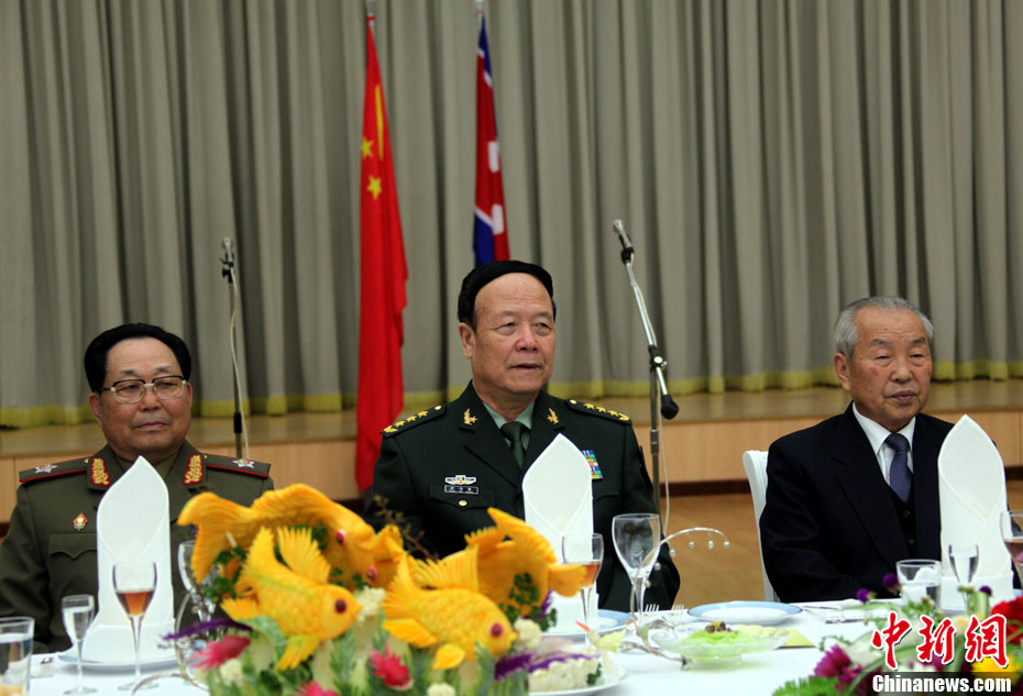 10月24日晚,朝鮮政府在平壤人民文化宮舉行盛大宴會,隆重紀念中國人民志愿軍赴朝參戰60周年。率領中國高級軍事代表團訪朝的中央軍委副主席郭伯雄(中)、朝內閣總理崔永林(右)等出席宴會。 中新社發 孫自法 攝