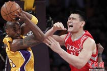 當地時間10月26日,洛杉磯,10/11NBA常規賽,休斯頓火箭客場110-112惜敗洛杉磯湖人。姚明出場23分21秒得到9分11個籃板,湖人隊科比拿下27分7次助攻。