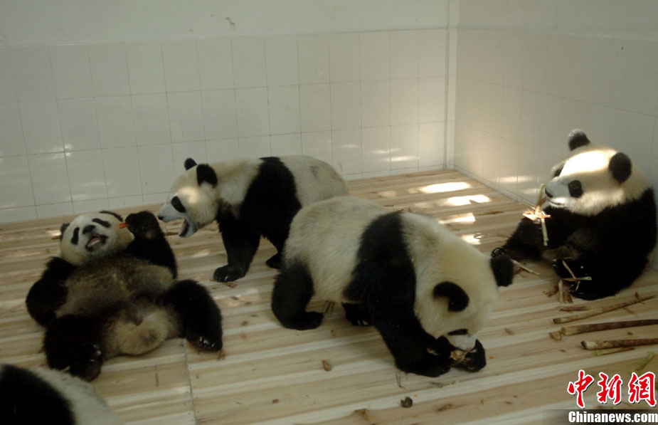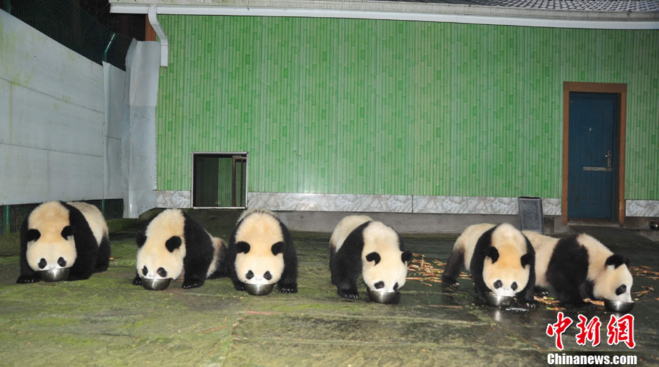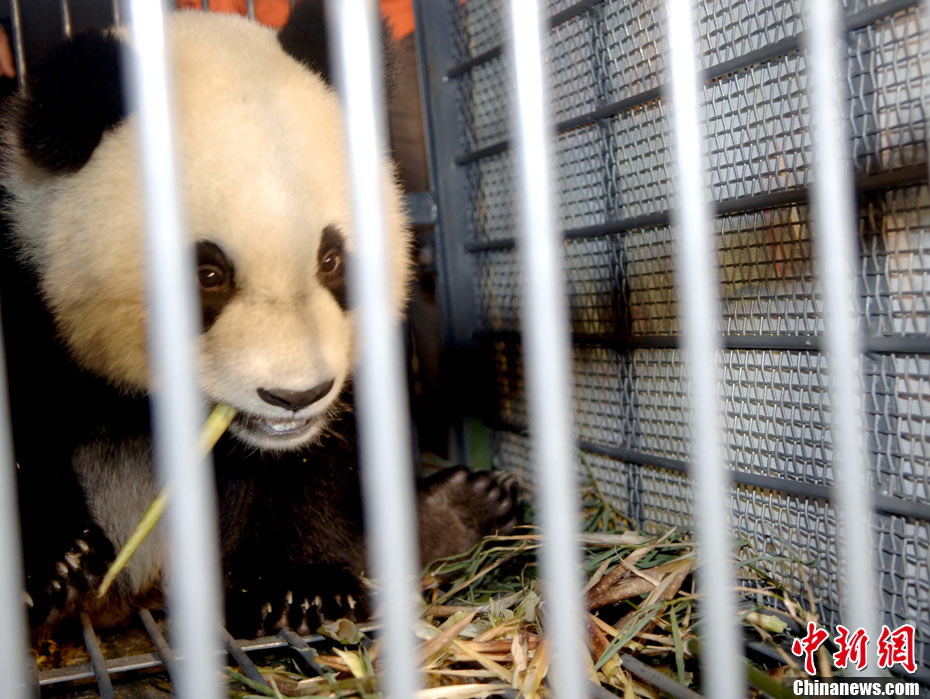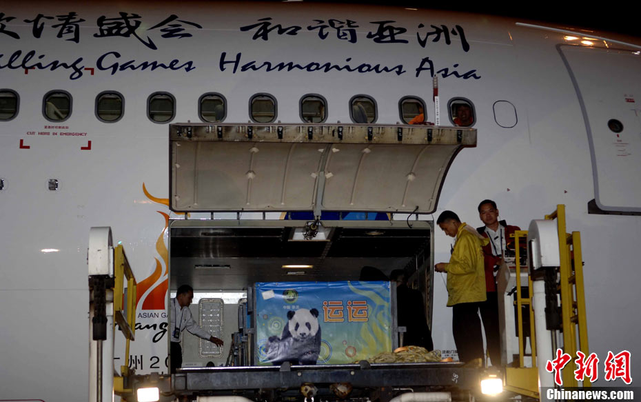 10月27日晚,6只出生于四川臥龍保護大熊貓研究中心的大熊貓乘“亞運號”專機抵達廣州,落戶香江野生動物世界,與動物園現有6只大熊貓共同組成“亞運熊貓團”,為下月在廣州舉行的第16屆亞運會助威。中新社發 劉衛勇 攝