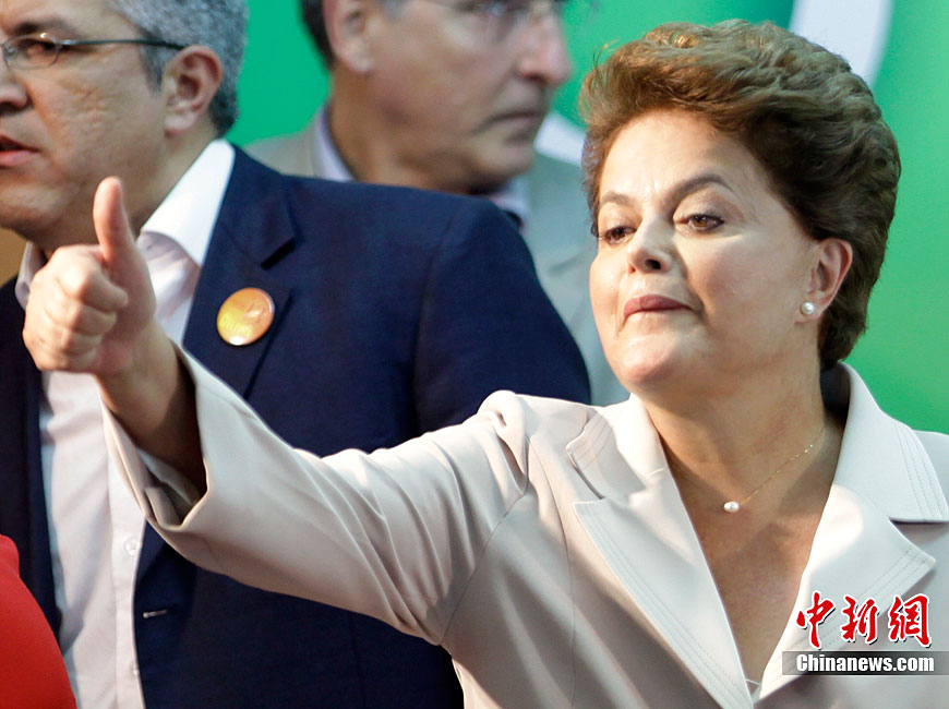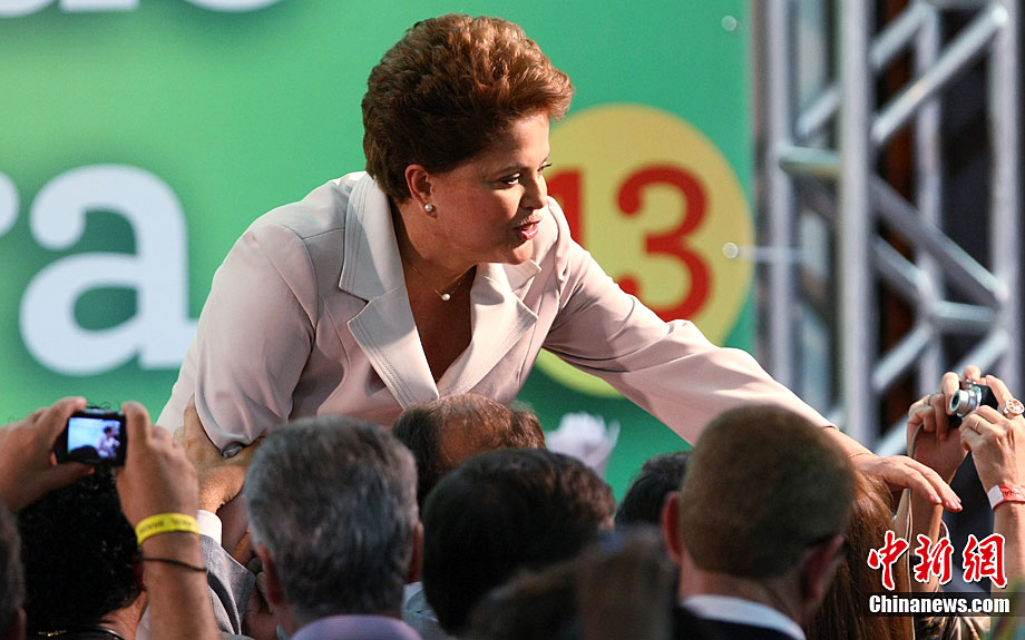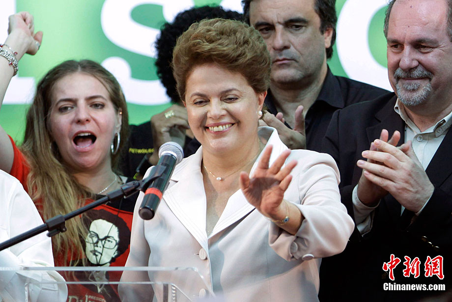 巴西當地時間10月31日選出該國首位女總統,當天巴西最高選舉法院宣布,根據已統計完的95%的選票,勞工黨候選人迪爾瑪·羅塞夫在第二輪投票中勝出,當選總統。現年62歲的羅塞夫獲得55%的選票,擊敗了唯一的競爭對手前圣保羅州州長、社會民主黨候選人若澤·塞拉。圖為10月31日,勞工黨候選人迪爾瑪·羅塞夫在巴西利亞舉辦獲勝演說。