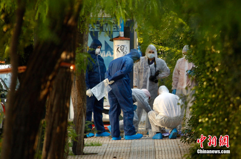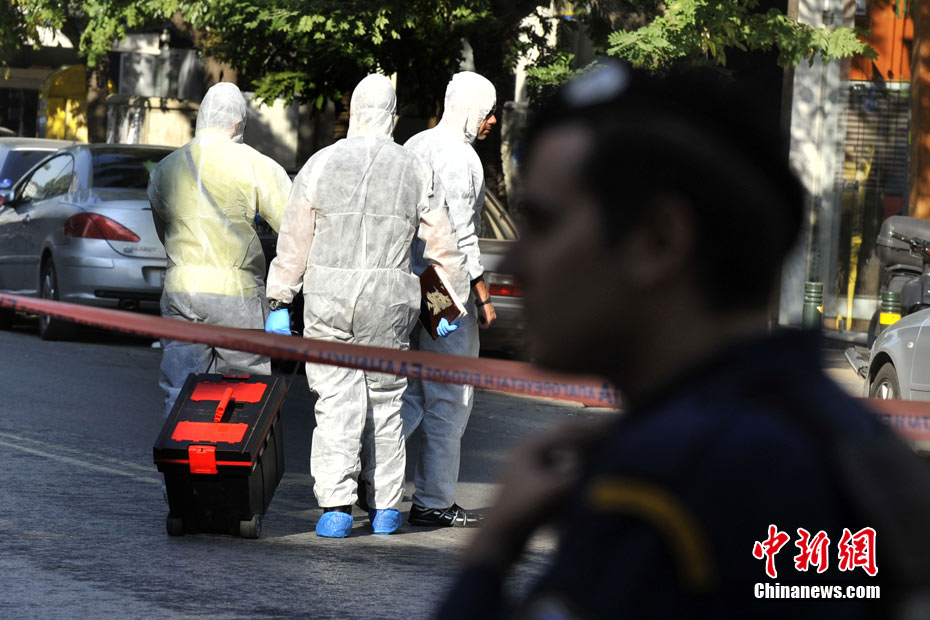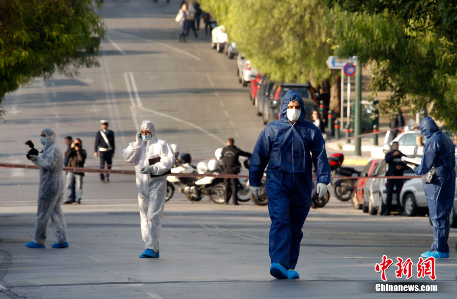 圖為爆炸事件發生后,希臘警方封鎖了發生爆炸事件的郵局及周邊地區。