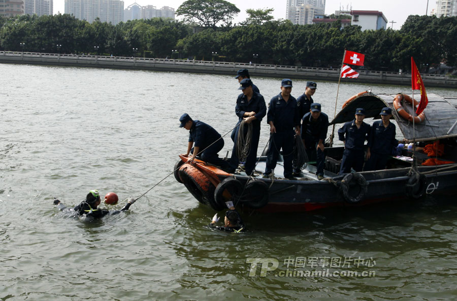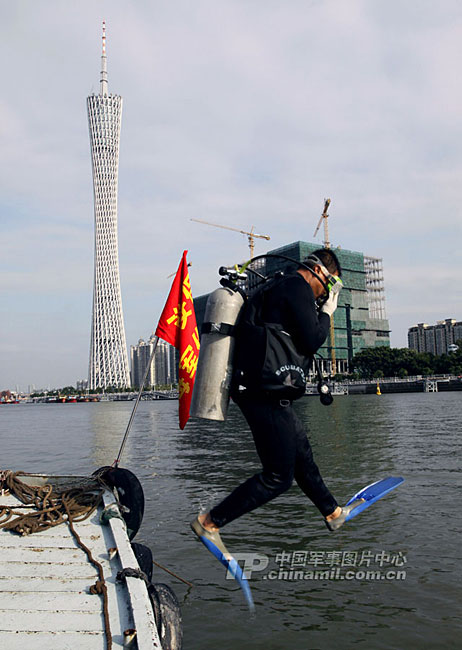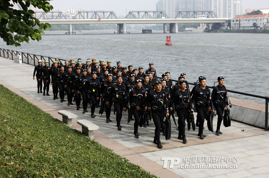 這支“蛙人”部隊是由海軍南海艦隊某支隊和防救船大隊的潛水部門分別派出共計80多位精兵強將組成的。作為我軍水上救援的重要力量,這支部隊多次出色完成了遠洋救生、深海打撈、搶險救災和遠洋測量等艱巨任務,不少人是身經百戰的潛水好手,其中不乏全國潛水紀錄的保持者。據安保作業副指揮員趙蹇黎介紹,此次來羊城,他們是應總部和海軍指派,前來配合廣州市公安局水警總隊,為今年的亞運會全方位水下安保進行全面保障。