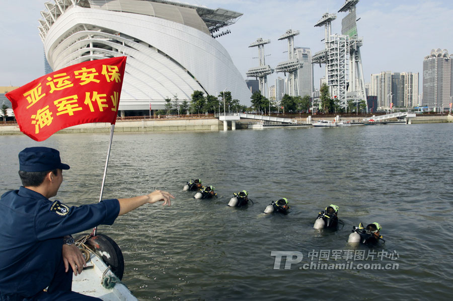 副指揮員趙蹇黎表示:“我們這支部隊在2008年已圓滿完成了對北京奧運會、殘奧會水下安檢任務,這是我們第二次參與大型運動會水下安保工作。雖然此次作業水域面積大、水質差、水流急、水下目標復雜、能見度差等諸多不利因素,但官兵們一致認為,不管困難有多大,任務有多重,服務亞運是一次光榮而艱巨的政治任務,我們將貫徹落實上級指示,提高認識,盡心盡責,保證圓滿順利地完成各項任務!”