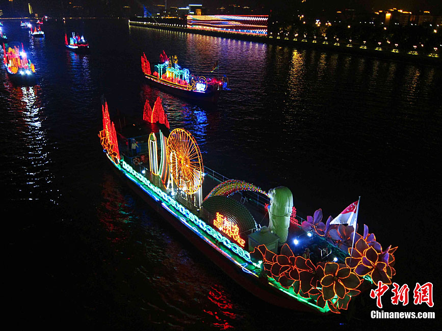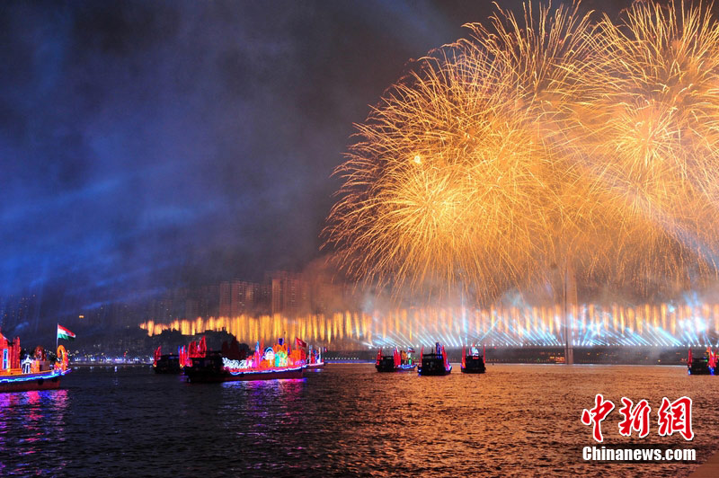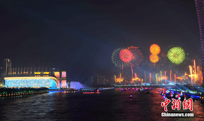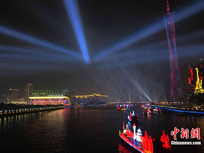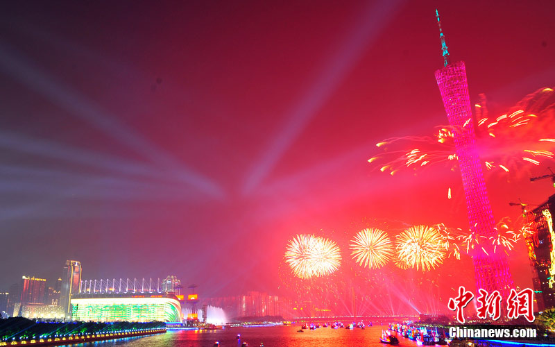 2010年11月3日晚,廣州海心沙上演包括煙花預演在內的亞運開幕式帶妝彩排。圖片來源:CFP視覺中國