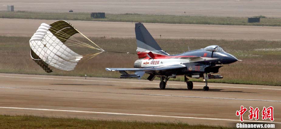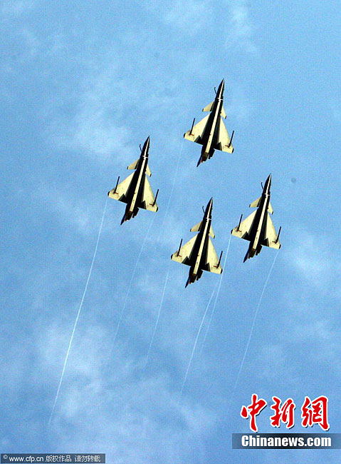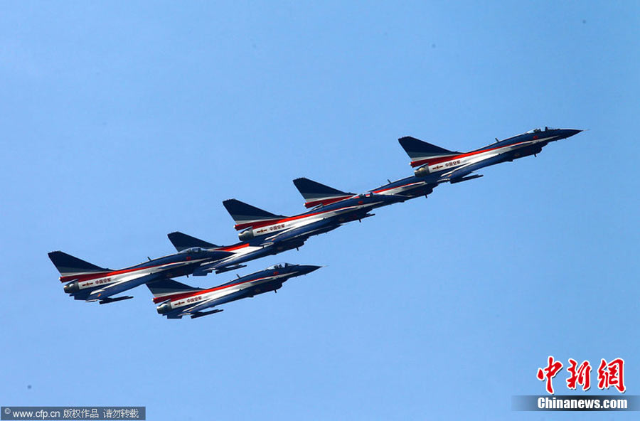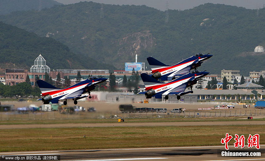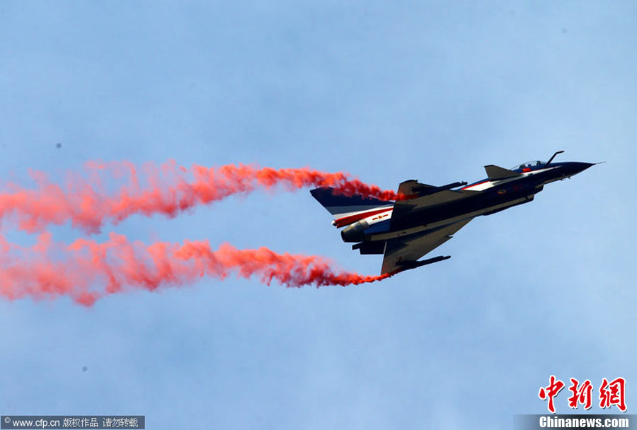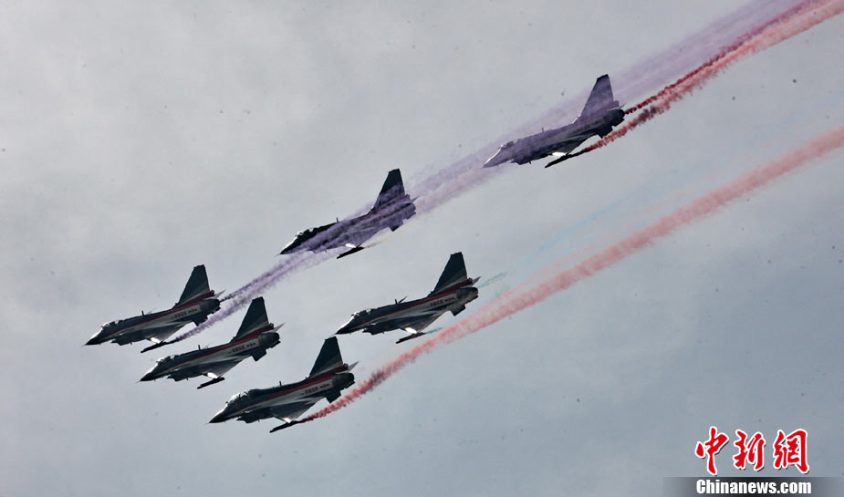 11月10日上午10點(diǎn)32分,隨著3架八一飛行表演隊(duì)的殲-10戰(zhàn)機(jī)起飛升空,八一飛行表演隊(duì)開(kāi)始了在珠海的首次飛行訓(xùn)練。圖為三機(jī)編隊(duì)特技演練。圖片來(lái)源:CFP視覺(jué)中國(guó) 趙梓 攝