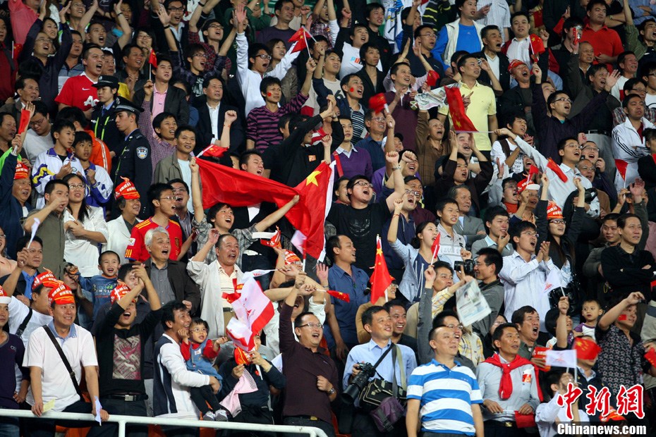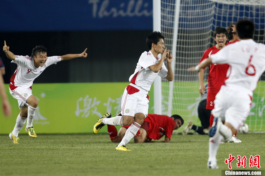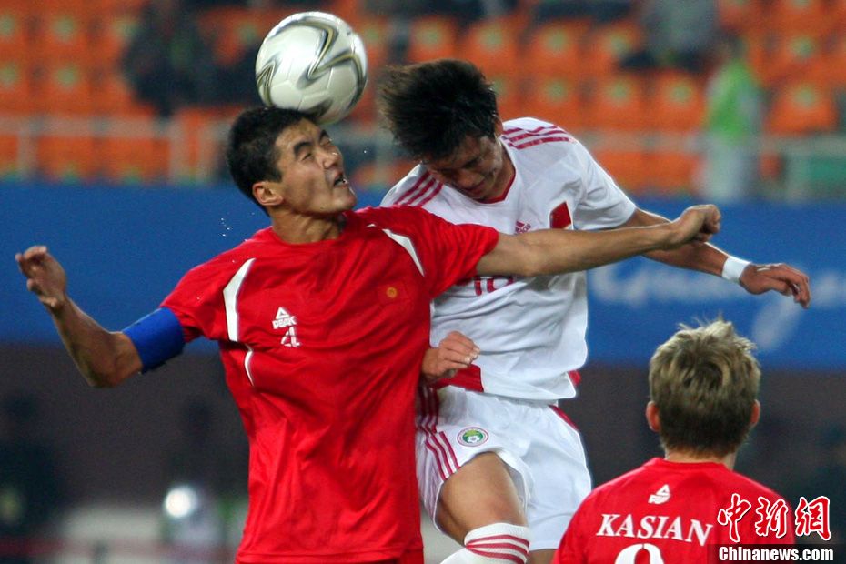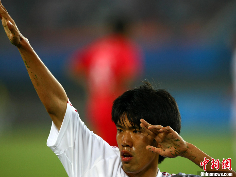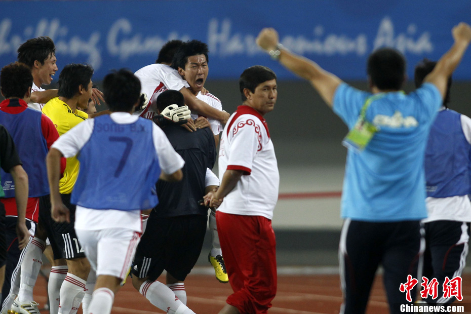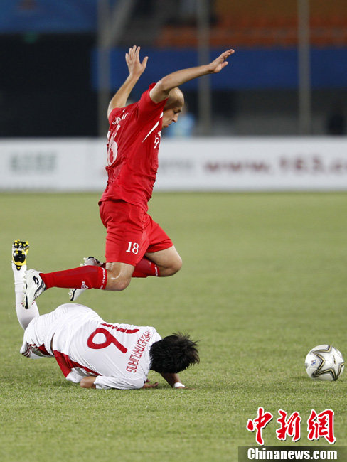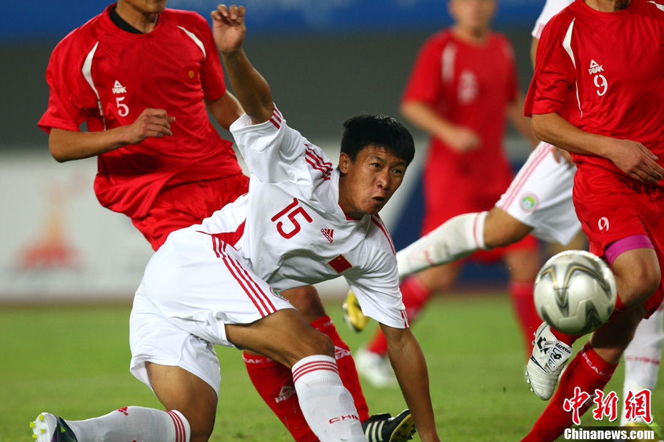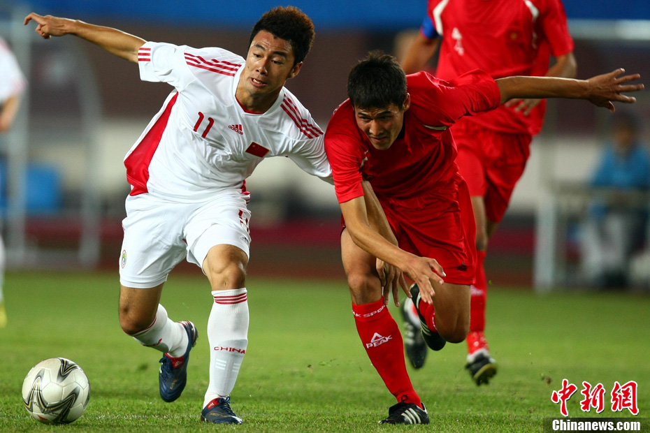 11月10日晚,廣州亞運會男子足球小組賽A組第19場中國與吉爾吉斯斯坦的比賽在廣州天河體育場進行,最終中國隊2:1戰勝吉爾吉斯斯坦隊。中新社記者 富田 攝