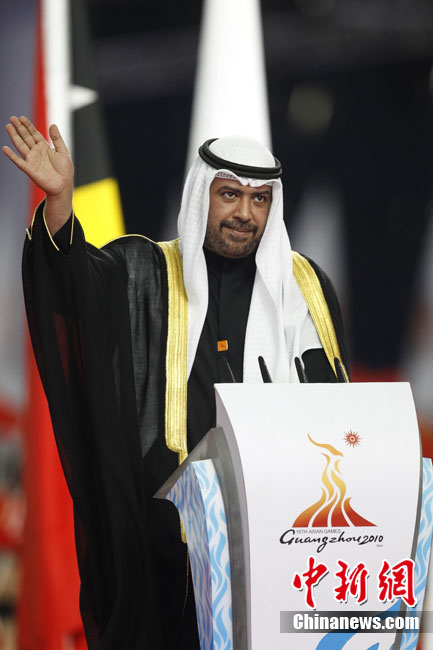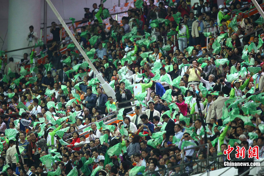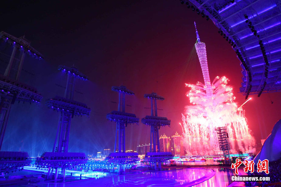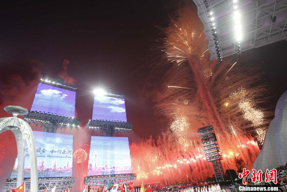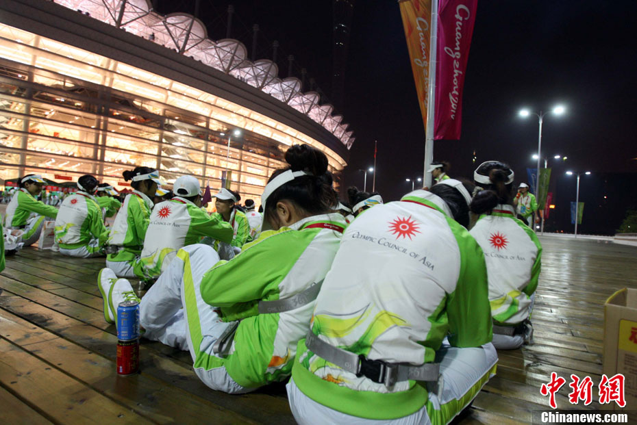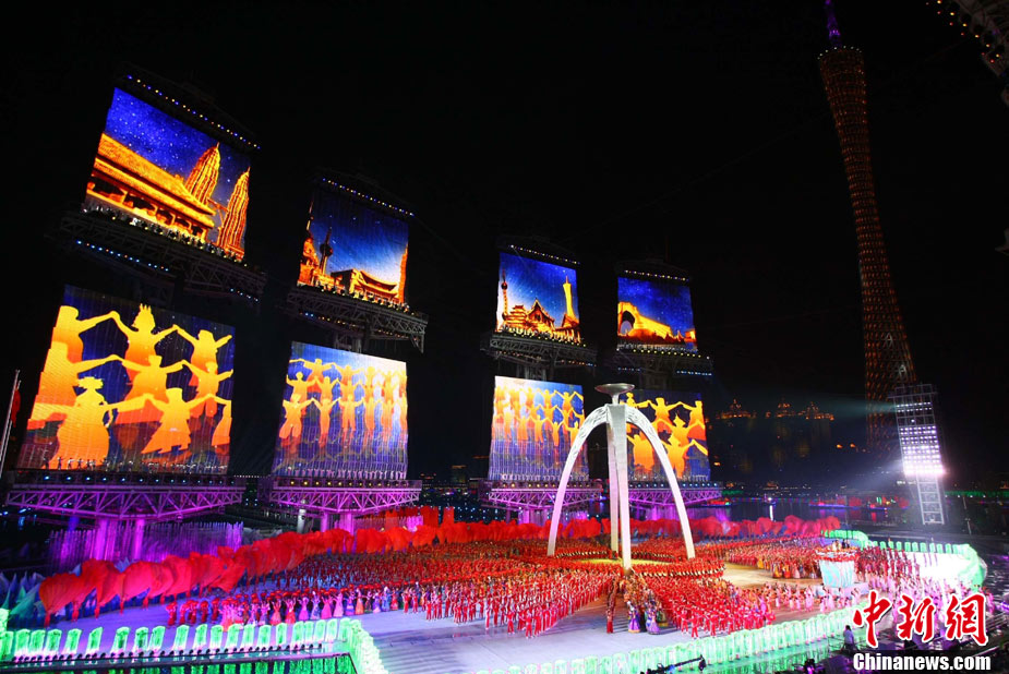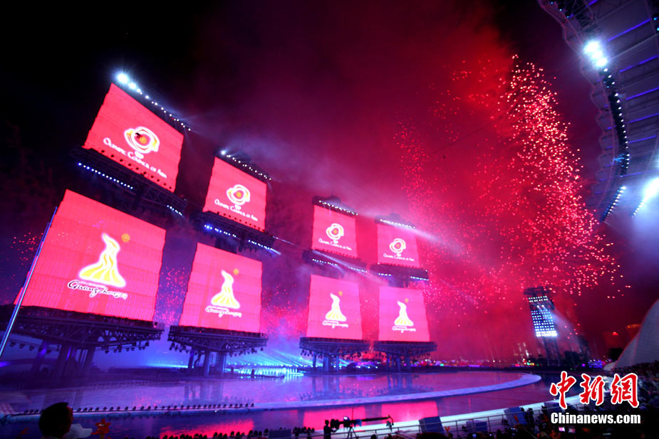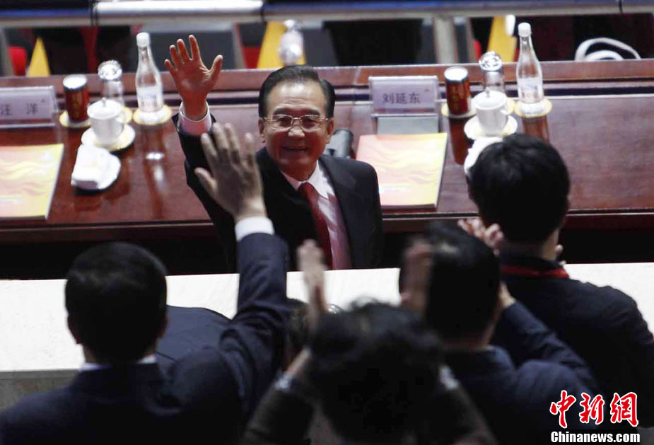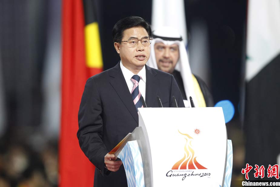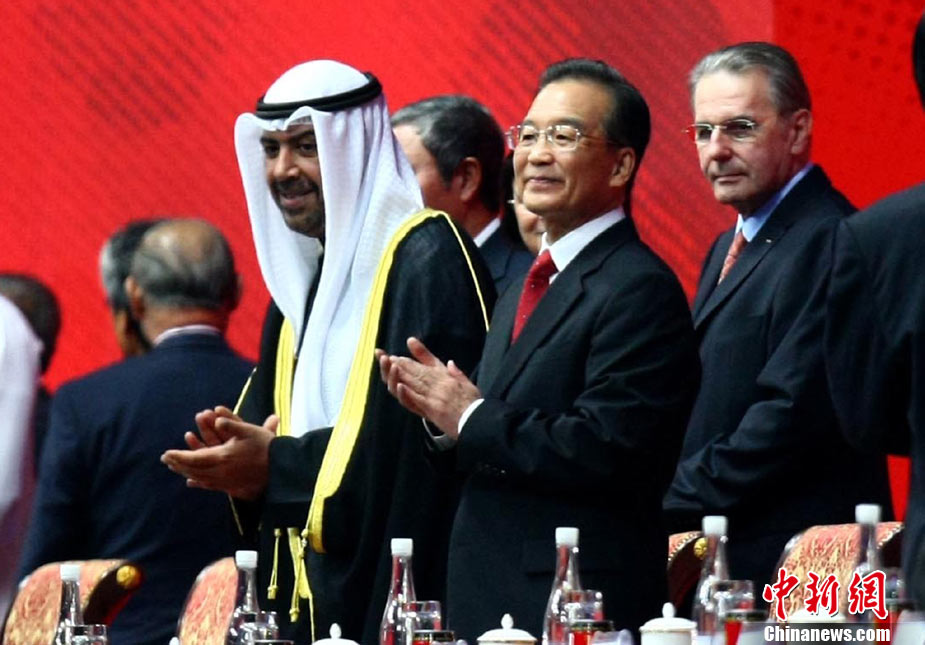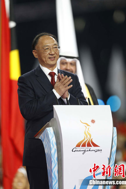 11月12日晚,第16屆廣州亞運會開幕。圖為溫家寶總理在開幕式現場向觀眾揮手致意。中新社記者 盛佳鵬 攝