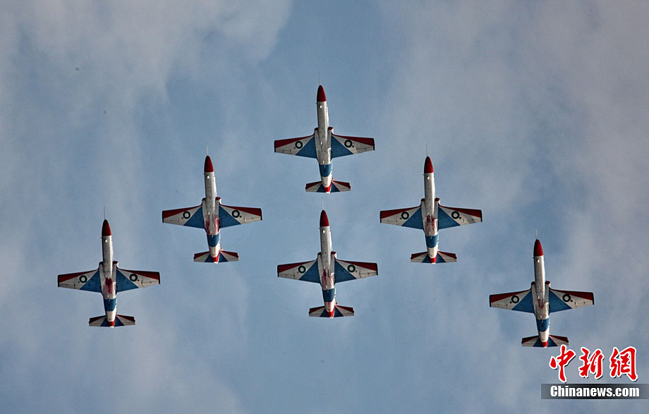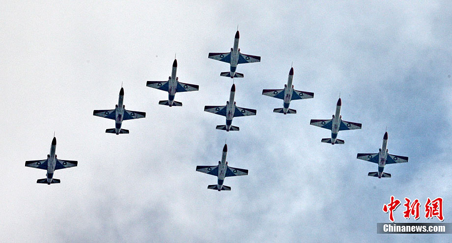 11月13日下午,巴基斯坦空軍“雄獅”飛行表演隊(duì)的飛行員駕駛k8教練機(jī)進(jìn)行九機(jī)密集隊(duì)形飛行訓(xùn)練。昨日,巴基斯坦空軍“雄獅”飛行表演隊(duì)抵達(dá)珠海,這支表演隊(duì)由10架K8教練機(jī)和一架C130運(yùn)輸保障機(jī)組成。由外國飛行員駕駛“中國造”飛機(jī)在中國航展上表演,必將是一道優(yōu)美而又特別的風(fēng)景。圖為巴基斯坦空軍“雄獅”飛行表演隊(duì)的飛行員駕駛k8教練機(jī)進(jìn)行九機(jī)密集隊(duì)形飛行訓(xùn)練。圖片來源:CNSPHOTO 喬天富 攝