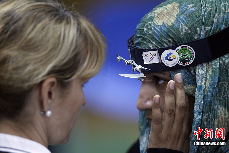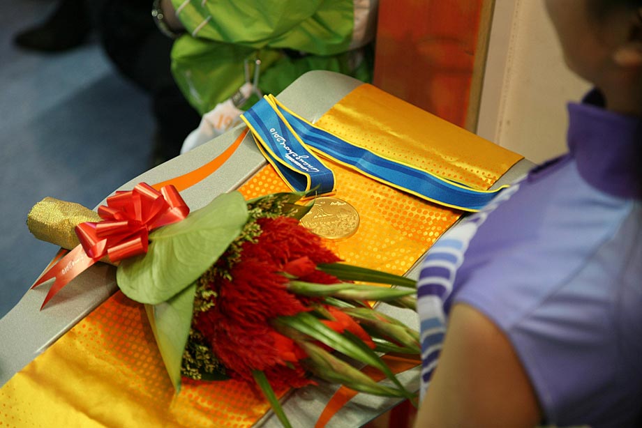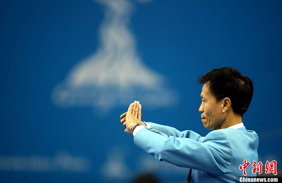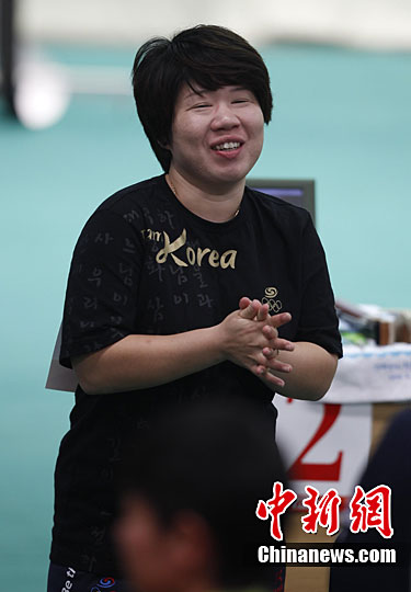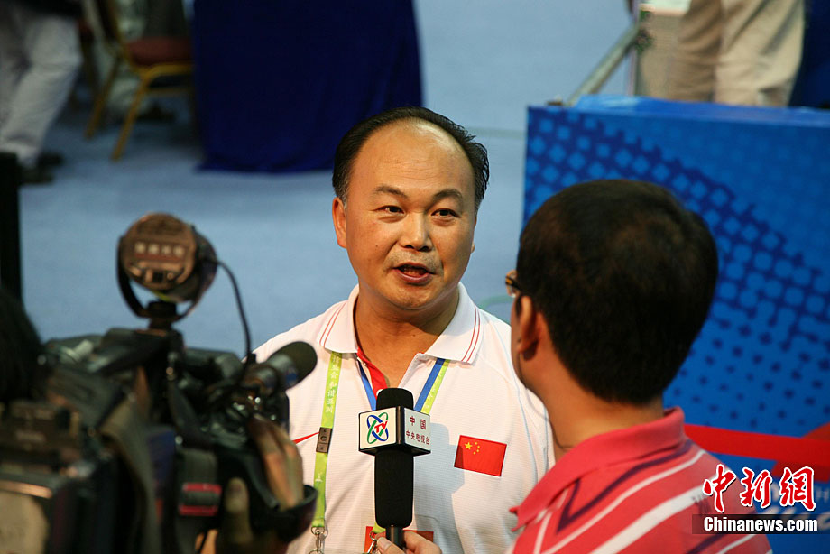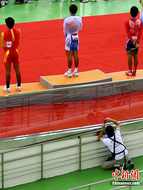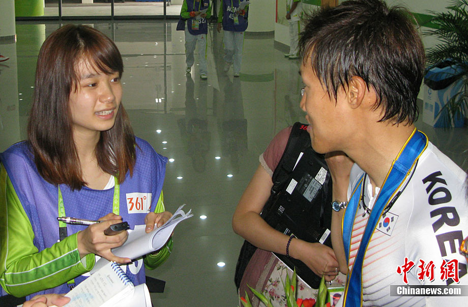 “對不起,我和你拉鉤鉤,一定會接受你的采訪。”這是韓國選手張仙軩14日下午以4分30秒298獲得亞運會自行車男子個人追逐賽冠軍后,安慰沒有采訪到他而痛哭的即時引語志愿者,展現出的溫馨場景。圖右為張仙軩。中新社記者 張子揚 攝