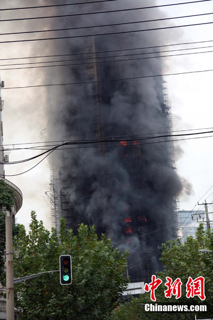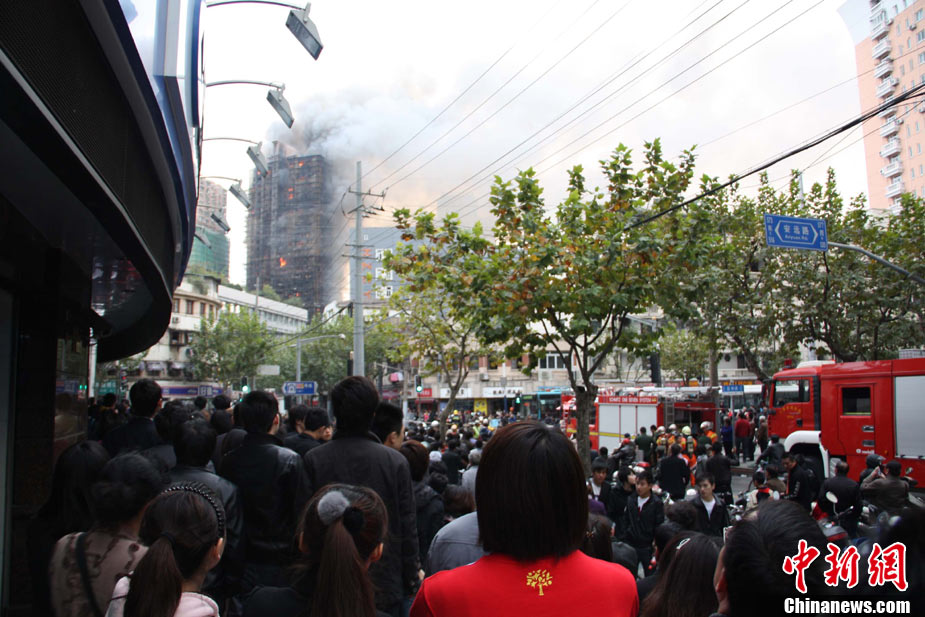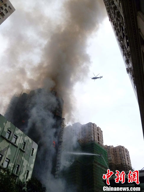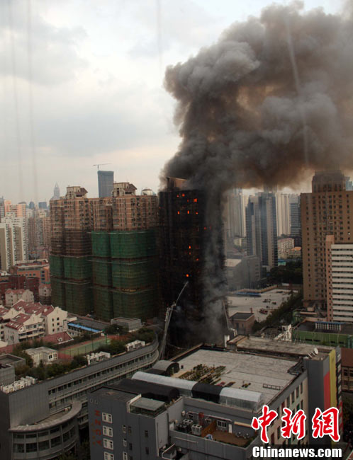 11月15日下午2時15分,上海中心城區靜安區正在進行外墻裝修的教師公寓的腳手架起火,火警發生后,公安民警、消防隊員迅速趕往現場救援,到場消防車超過10輛。起火原因和損失狀況正在進一步調查中。中新社發 張嘉森 攝