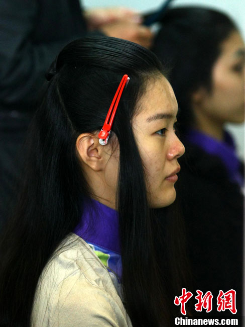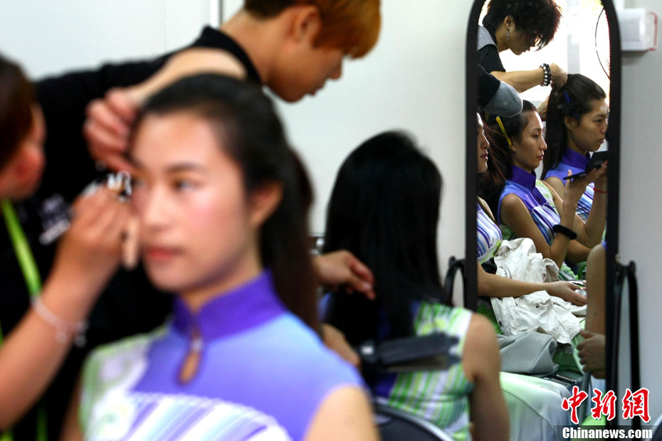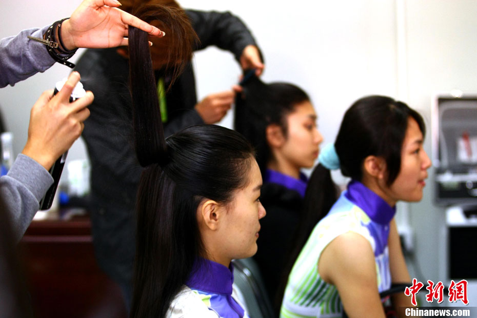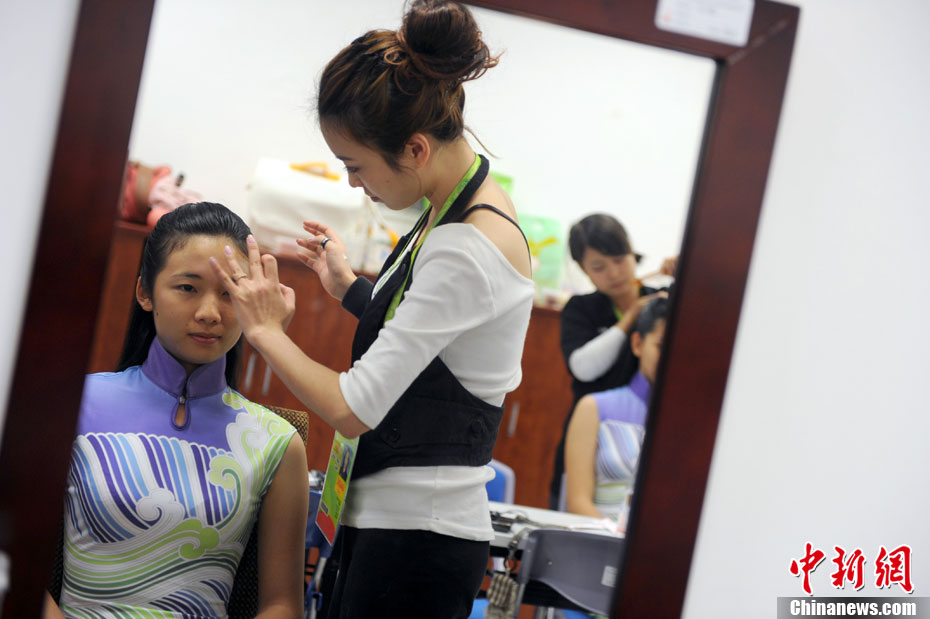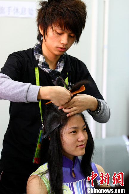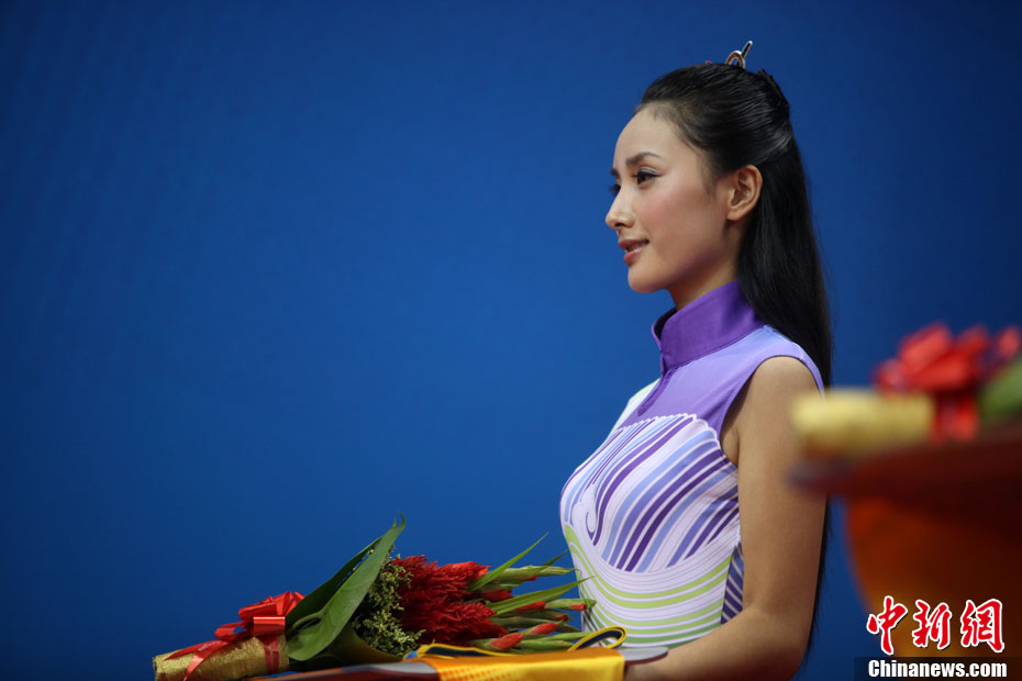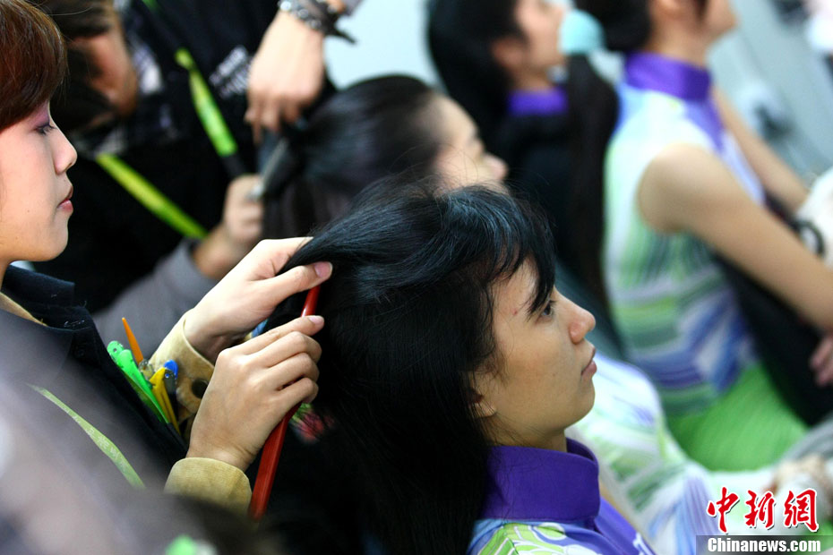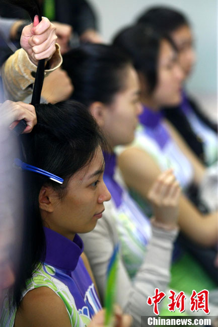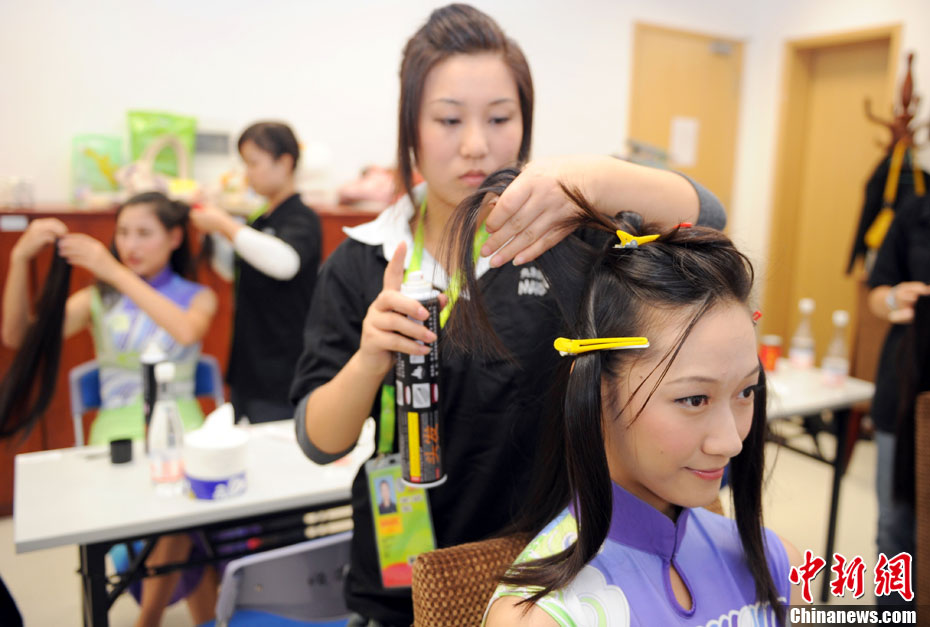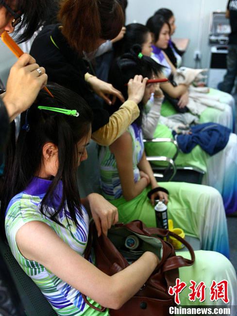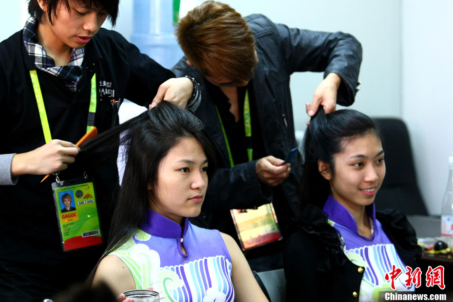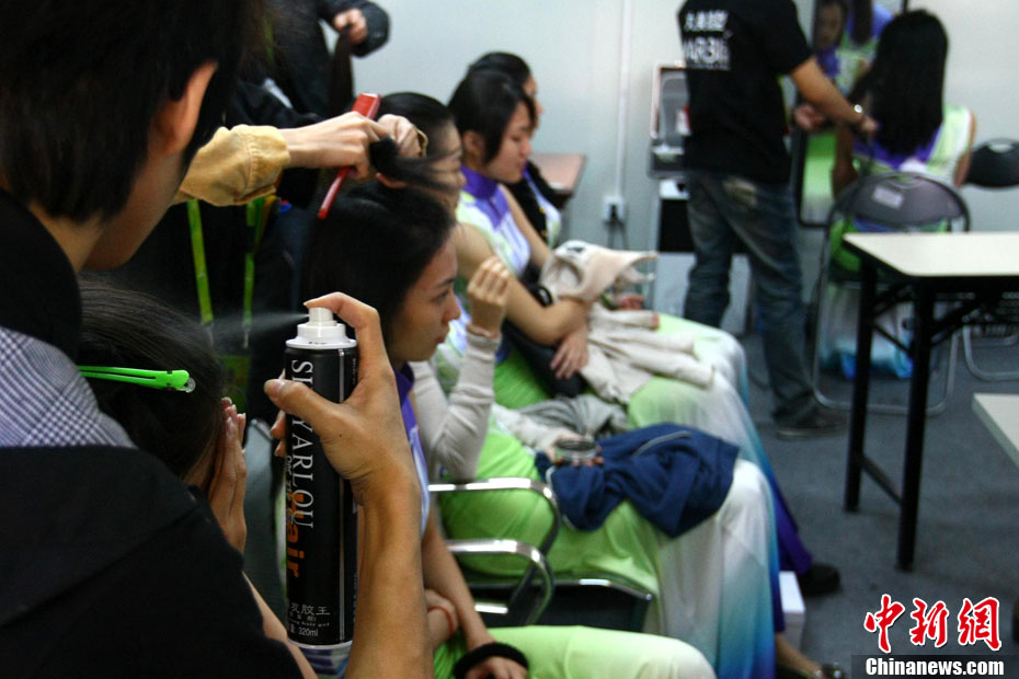 廣州亞運(yùn)會比賽開始后,對于這些美麗的姑娘們“戰(zhàn)斗”才剛剛打響,她們每天早上6點(diǎn)半就起床,趕到賽場,開始4個(gè)小時(shí)的準(zhǔn)備工作——化妝、做頭發(fā)、整體造型,這一切都為頒獎(jiǎng)典禮的那短短一刻。