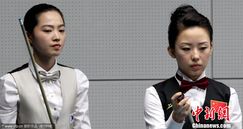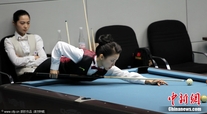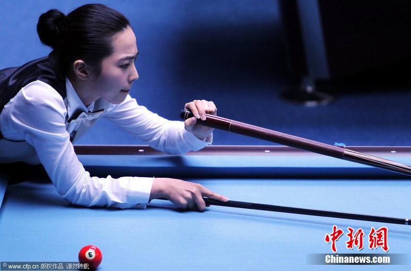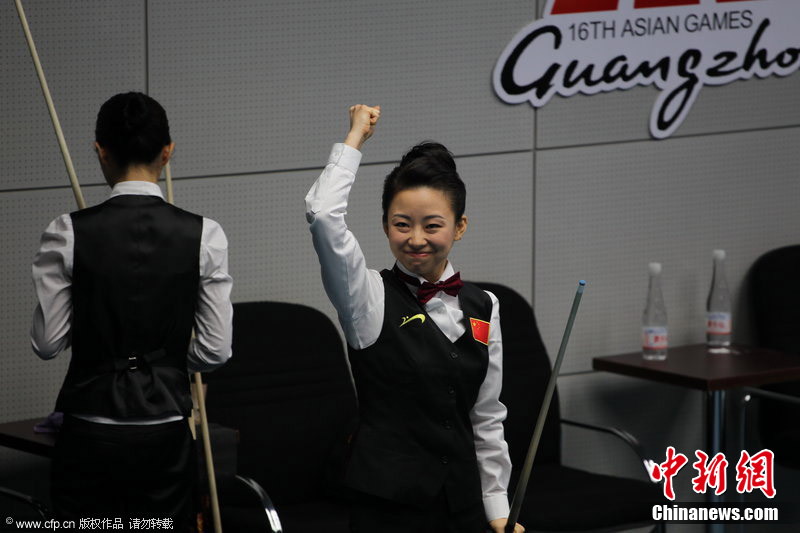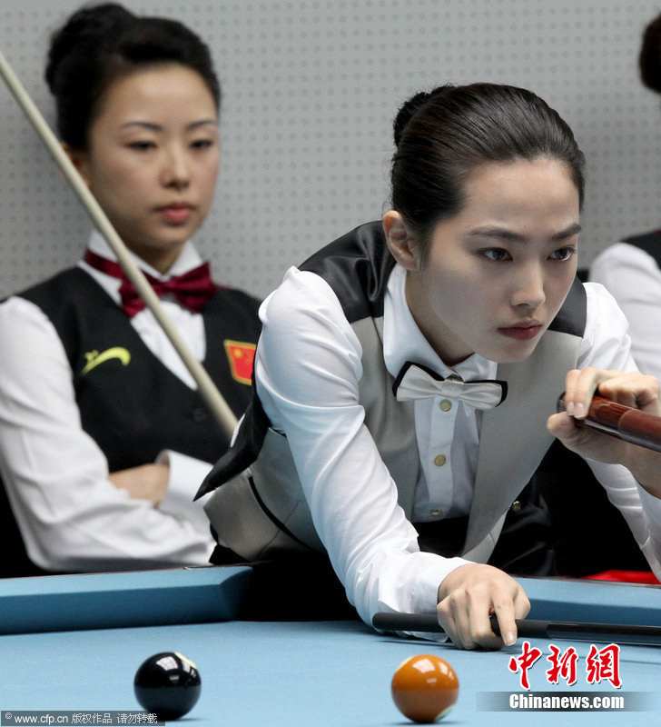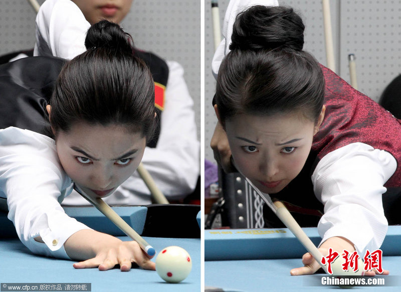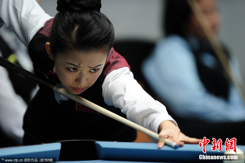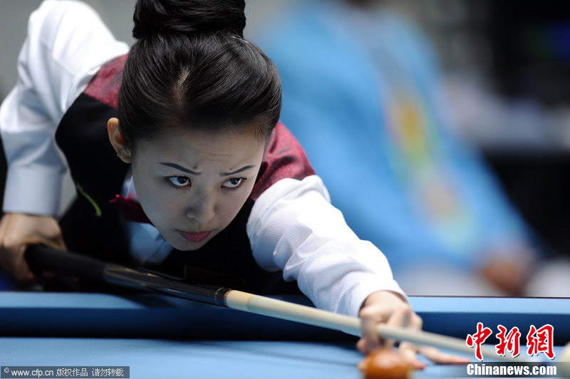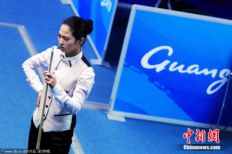 11月18日,2010廣州亞運會女子美式9球單打1/4決賽,兩位公認(rèn)的臺壇美女展開激烈爭奪,最終,中國選手潘曉婷以7:6的最終比分戰(zhàn)勝韓國的車侑藍(lán)(車俞嵐)晉級下一輪。圖片來源:cfp視覺中國
