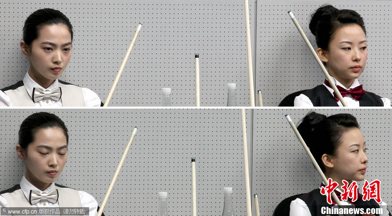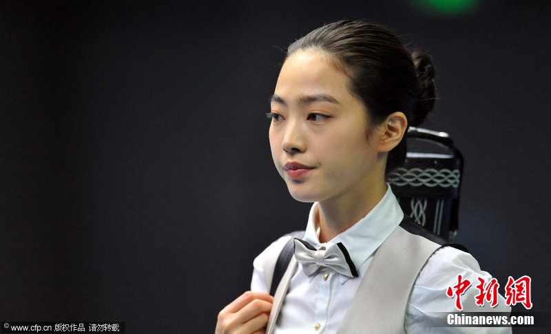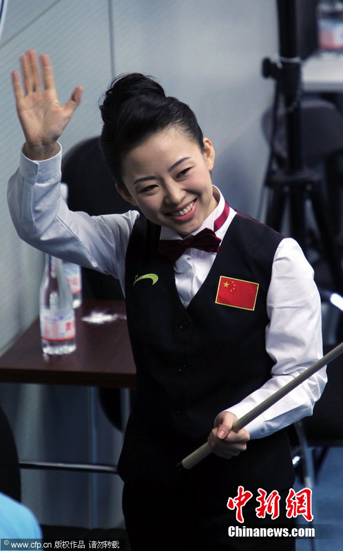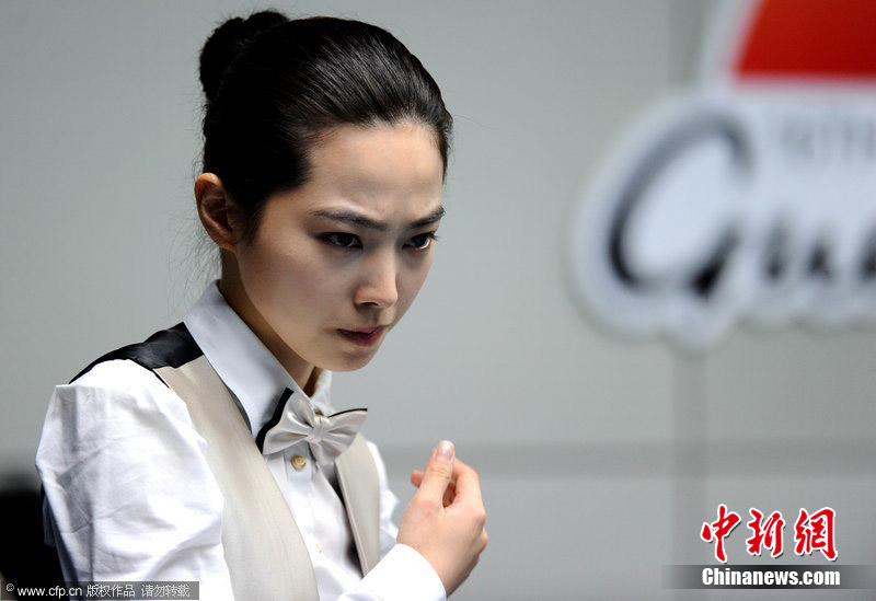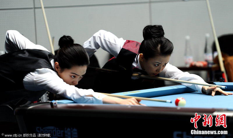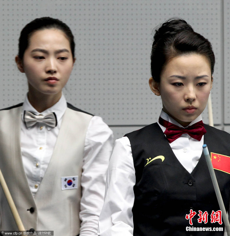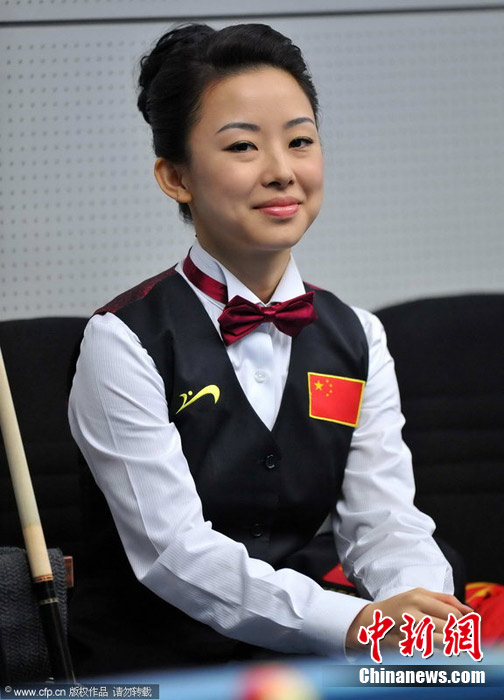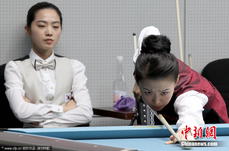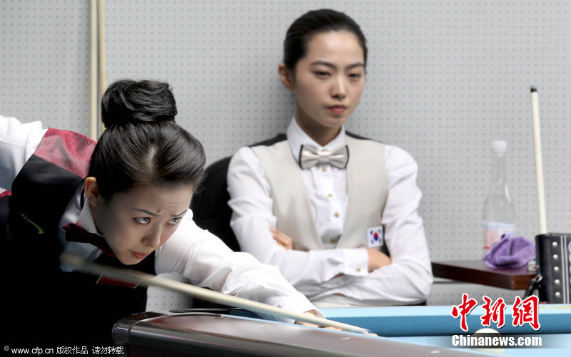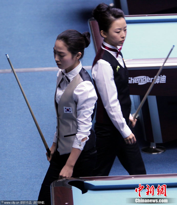 11月18日,2010廣州亞運會女子美式9球單打1/4決賽,兩位公認(rèn)的臺壇美女展開激烈爭奪,最終,中國選手潘曉婷以7:6的最終比分戰(zhàn)勝韓國的車侑藍(lán)(車俞嵐)晉級下一輪。圖片來源:cfp視覺中國