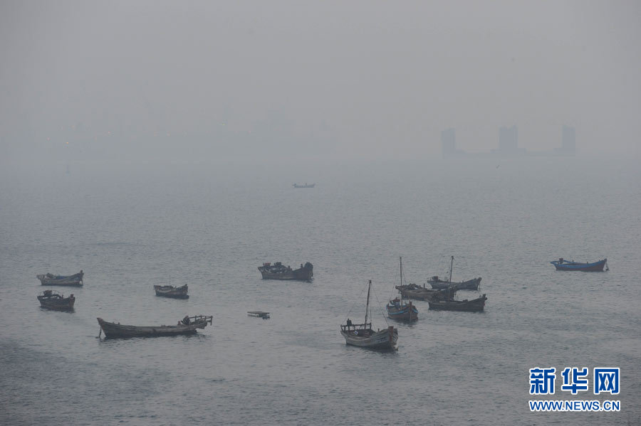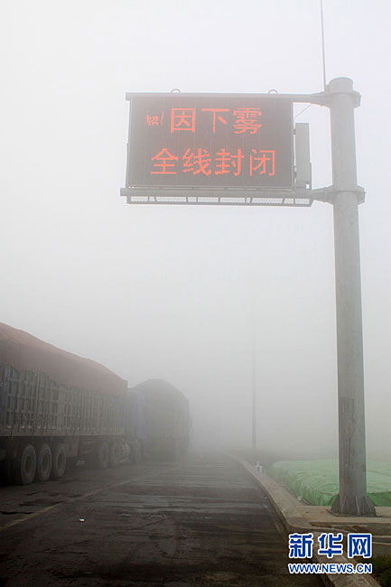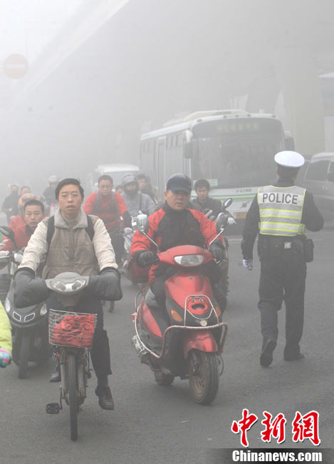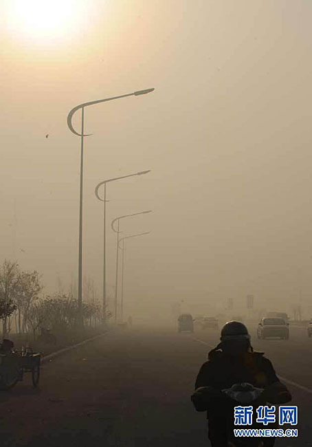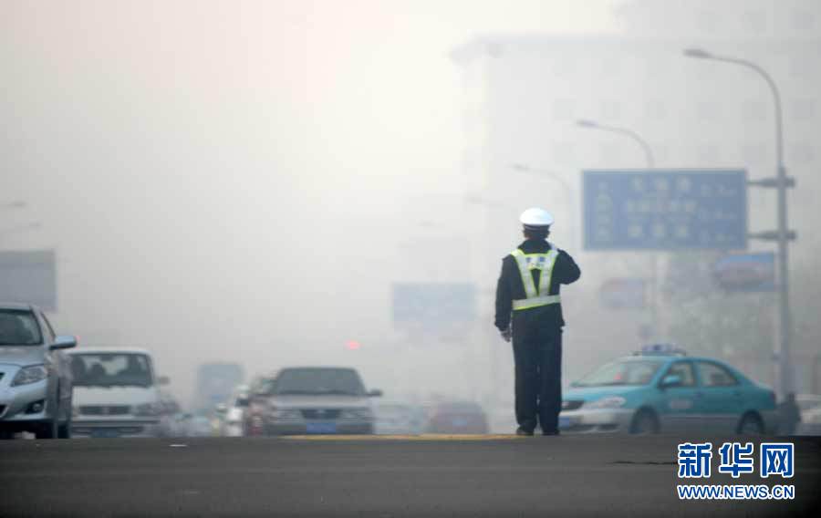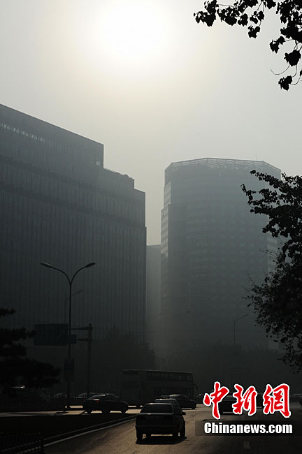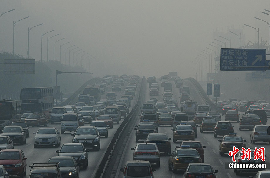 11月19日上午,北京被霧霾天籠罩,能見度較低,西二環路上的汽車緩慢前行。中新社記者 侯宇 攝