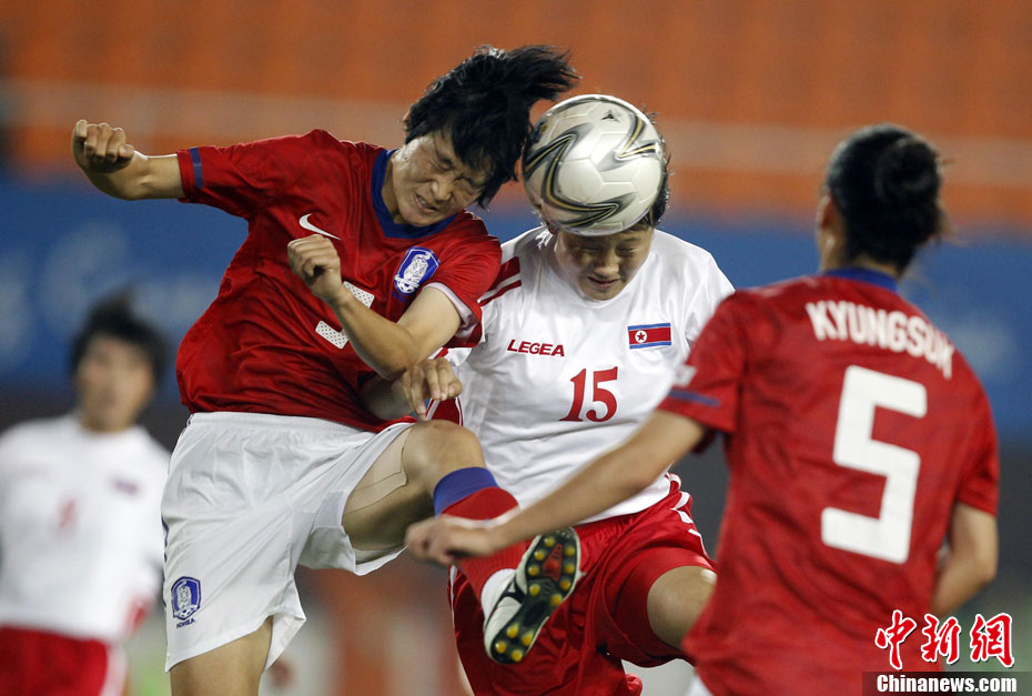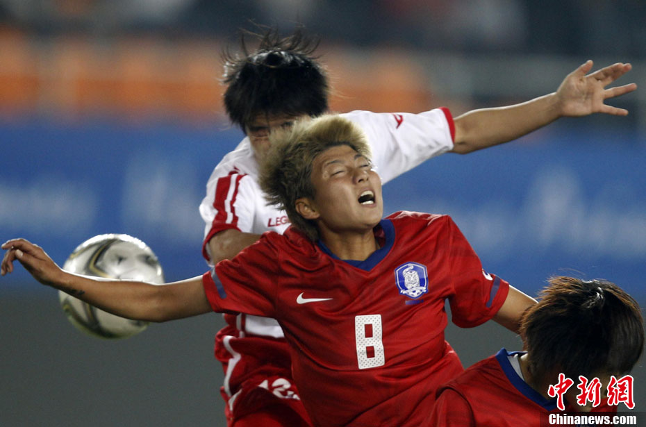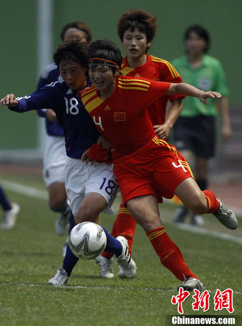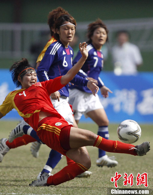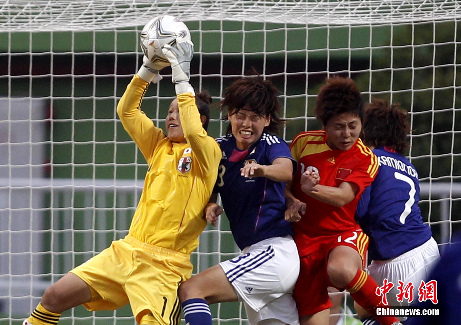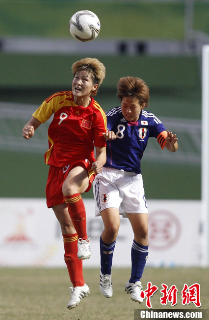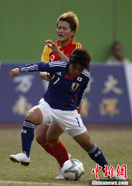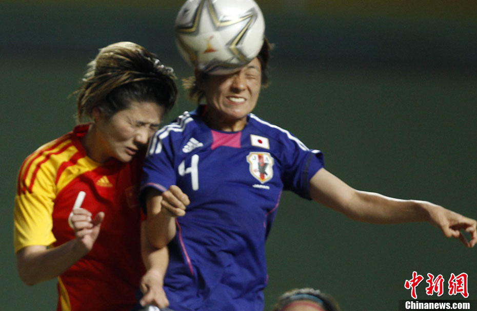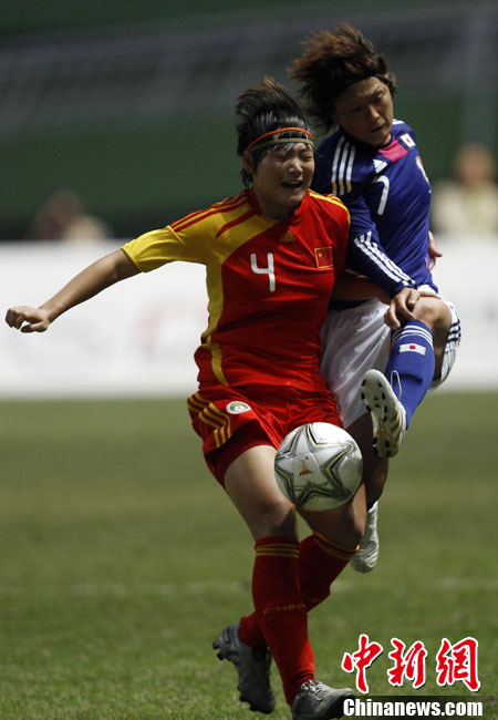 11月20日,在廣州亞運會女足半決賽的比賽中,中國女足(紅衣)0:1惜敗日本隊,無緣決賽。 中新社記者 杜洋 攝