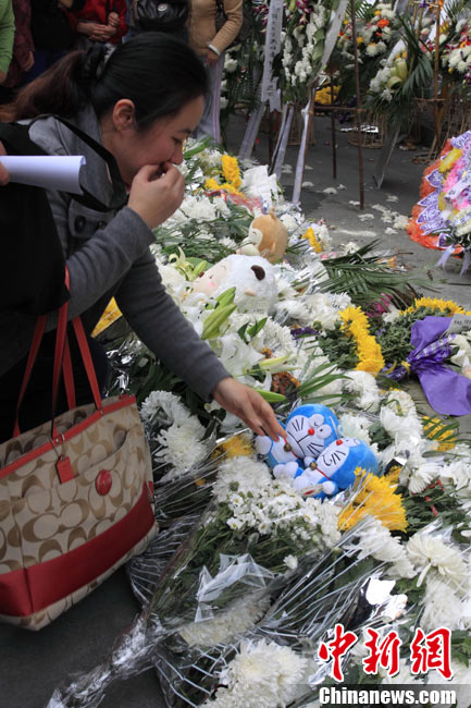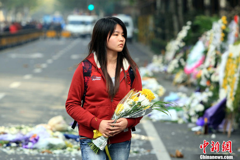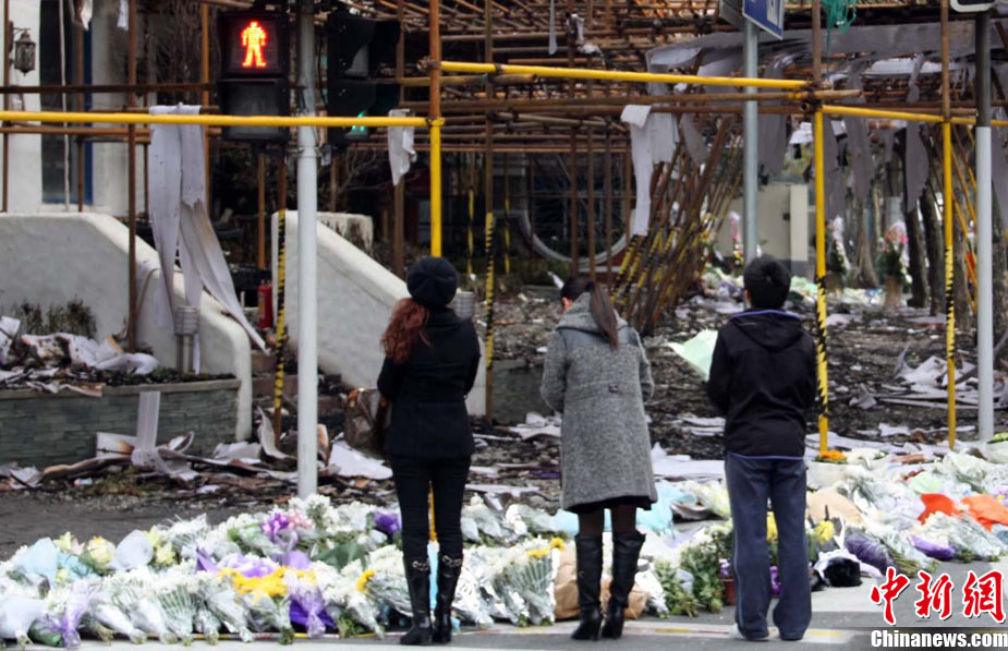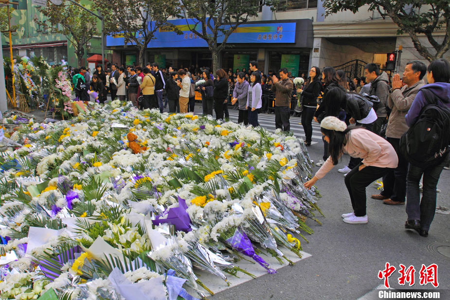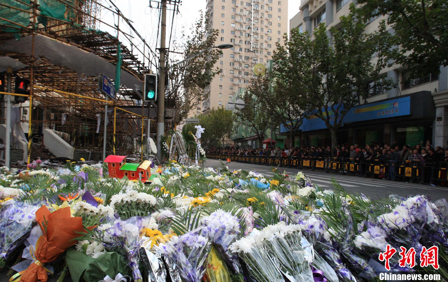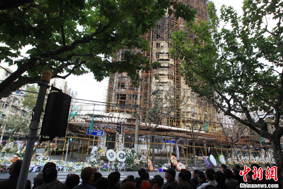 11月21日,上海在靜安區“11·15”特大火災現場舉行向遇難者致哀活動。中新社記者 潘索菲 攝