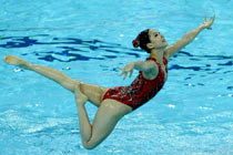 11月20日,廣州亞運會花樣游泳集體技術自選動作比賽舉行,五支參賽隊伍悉數亮相。圖為泰國“美人魚”從水中躍起。中新社記者 富田 攝