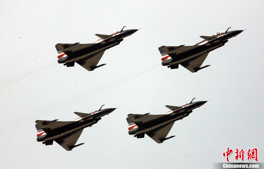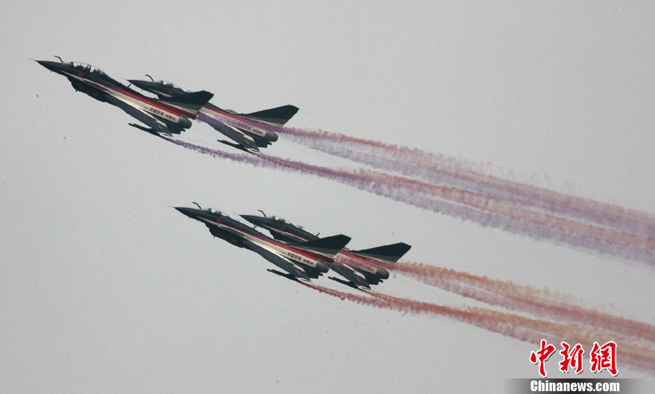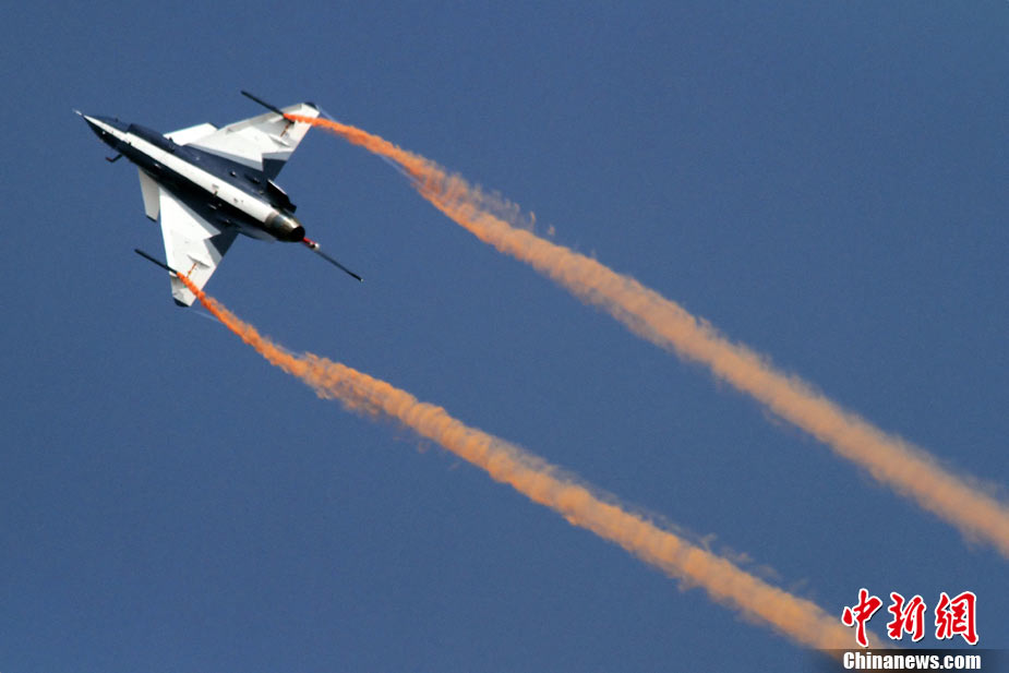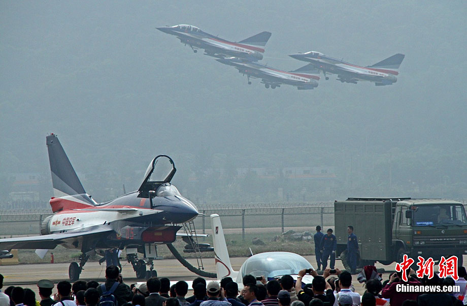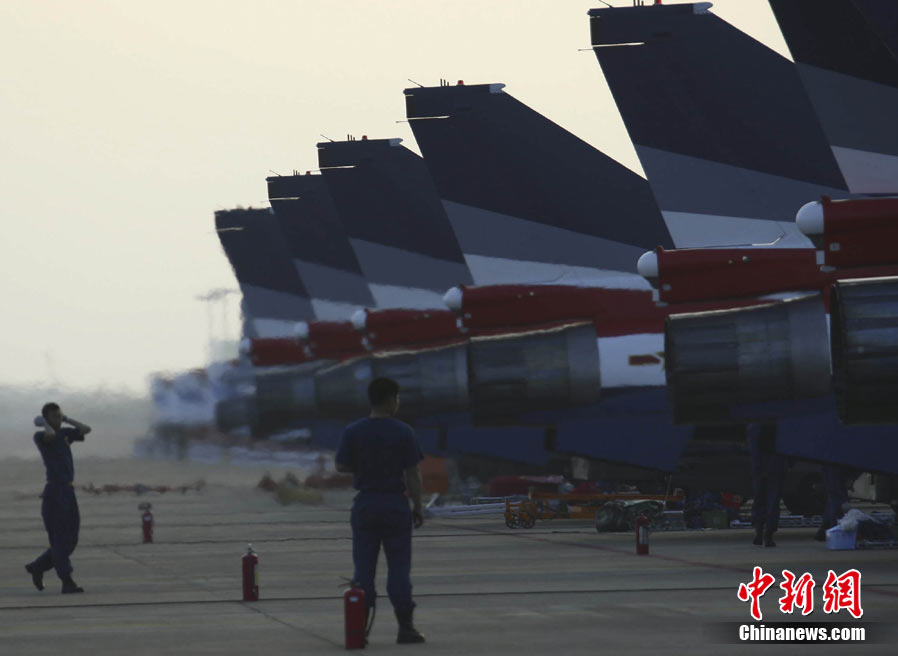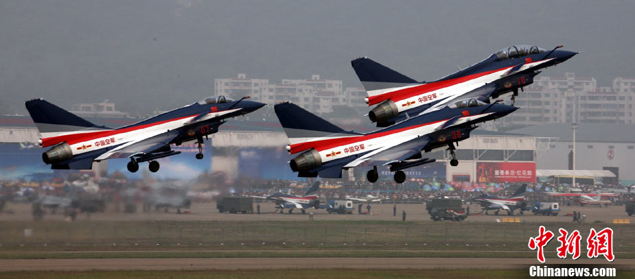 11月21日,為期6天的第八屆中國國際航空航天博覽會在珠海落幕。圖為中國空軍八一飛行表演隊表演結(jié)束后,機務(wù)人員試車作準(zhǔn)備飛行工作。 中新社發(fā) 譚超 攝