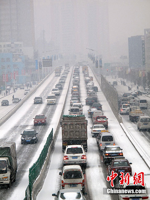 新疆烏魯木齊11月22日上午再度降下大雪,由于大雪的緣故,烏魯木齊街道部分路段交通擁堵,車輛排起長隊。中新社記者 孫亭文 攝