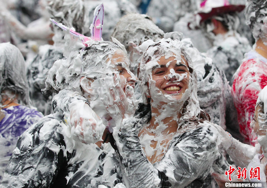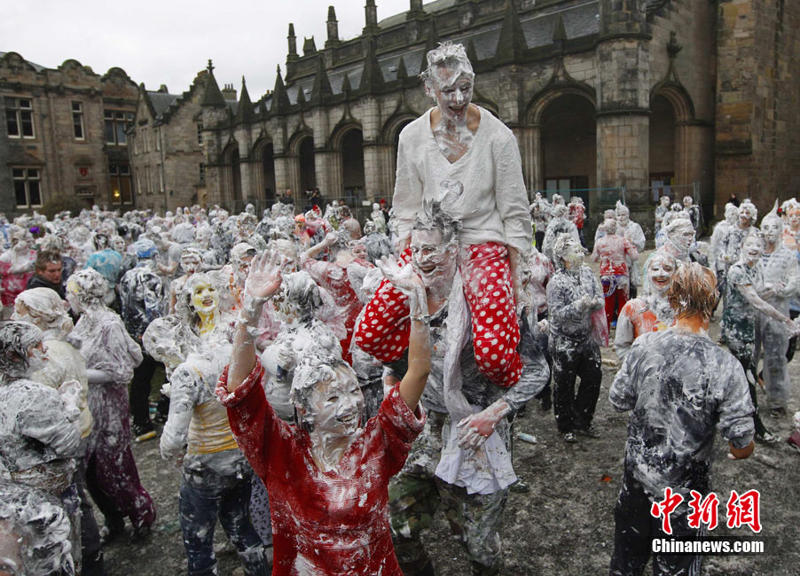 2010年11月22日,在蘇格蘭圣安德魯斯大學(xué)舉行的“周一葡萄干”節(jié)中,大學(xué)生們進(jìn)行了一場別開生面的“泡沫大戰(zhàn)”。