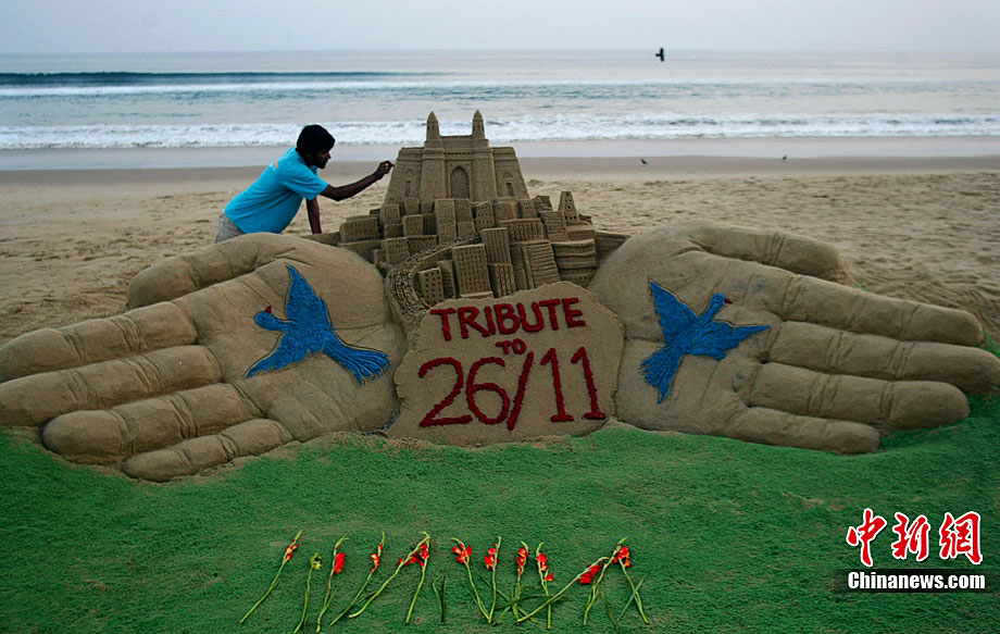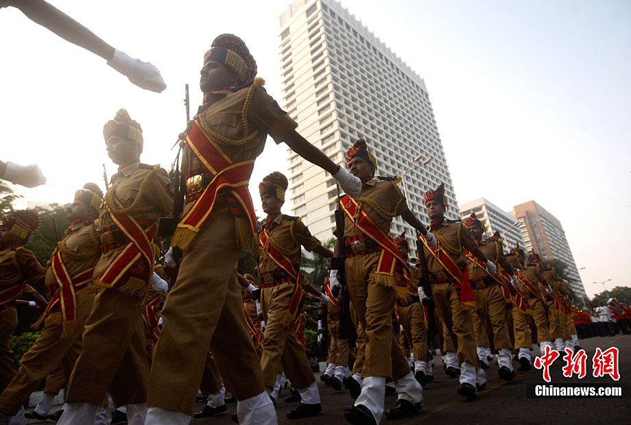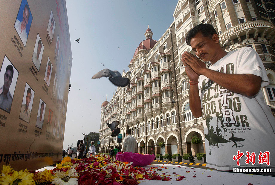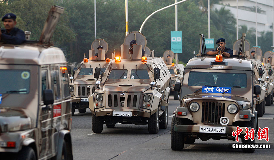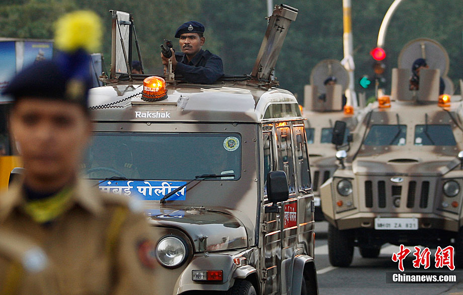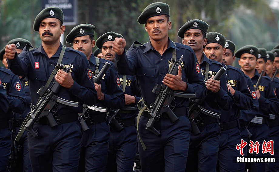 11月26日,警察在印度孟買的海濱大道上舉行閱兵式,悼念恐怖襲擊事件中的遇難者并表達反恐決心。2008年11月26日夜至29日,印度商業中心孟買的泰姬馬哈酒店、奧貝羅伊酒店、猶太人中心以及孟買火車站等地遭遇連環恐怖襲擊,造成至少195人死亡,大約300人受傷。