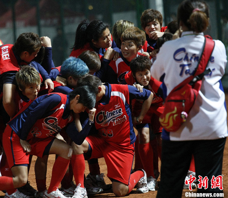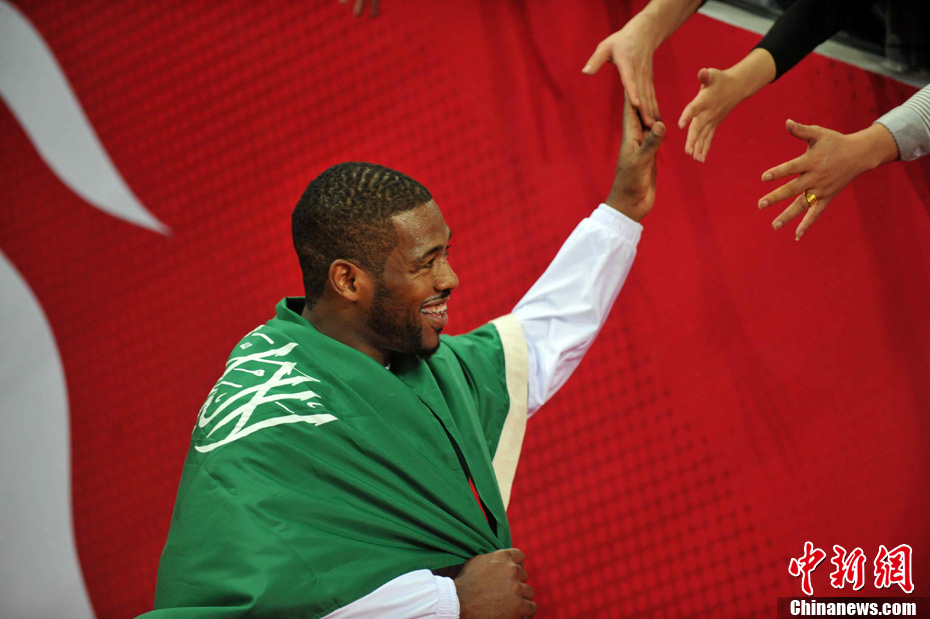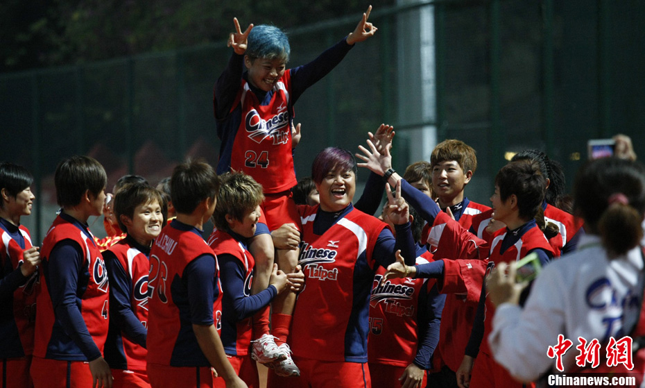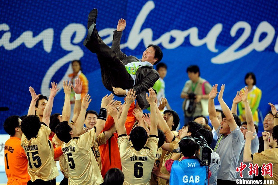 11月26日晚,韓國隊在廣州大學城以32:28戰勝伊朗隊奪得亞運會男子手球決賽金牌。韓國隊員將教練高高拋起慶祝勝利。中新社記者 陳文 攝