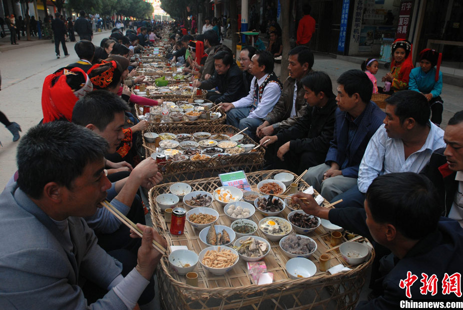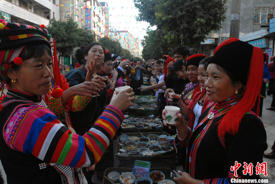 11月30日,有“天下第一宴”、“世界最長的宴席”美稱的云南綠春哈尼族長街宴于在云南綠春縣開宴,來自海內外上萬名游客參加了今年的長街宴。此次長街宴共設1860桌全長近2000米。云南綠春哈尼長街宴于2008年以3050桌全長4000米被上海吉尼斯認證為“世界最長的宴席”。中新社發 任東 攝