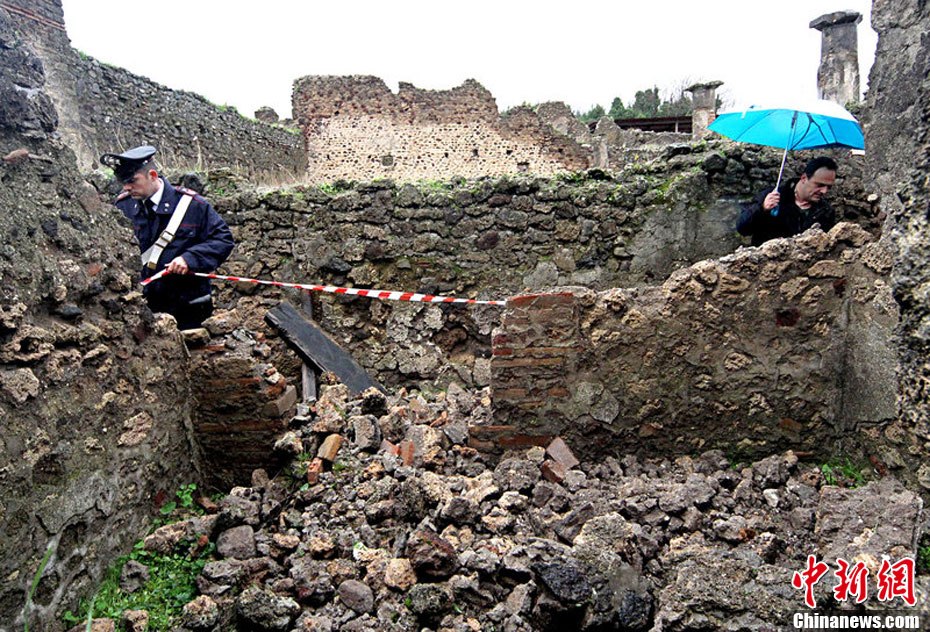 11月30日,有兩千多年歷史的龐貝古城一處古建筑的墻壁發(fā)生坍塌,當(dāng)?shù)乜脊艑<曳Q,這是由于連日來的持續(xù)降雨所致,不過倒塌的墻壁上沒有壁畫。就在此前一天,同樣由于降雨,龐貝古城的“道德者之家”外墻也發(fā)生倒塌。所幸這堵巖石外墻距離“道德者之家”還有一段距離,坍塌沒有威脅到建筑外墻的著名題詞。這兩起建筑倒塌事件被視為近期龐貝古建筑的“新傷”。圖片來源:CFP/視覺中國