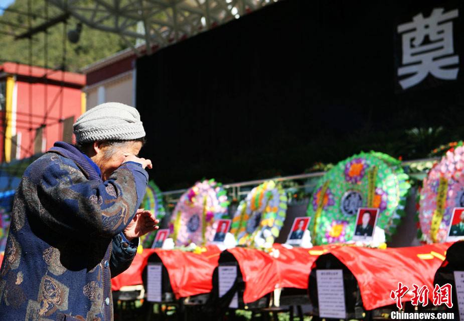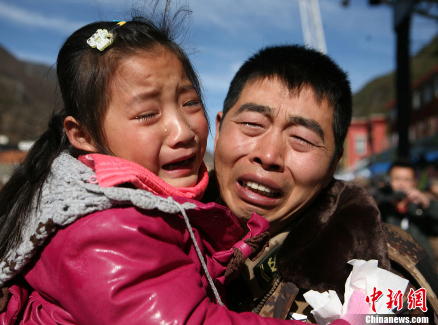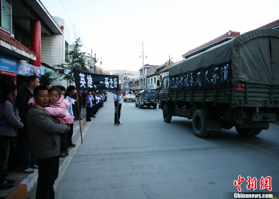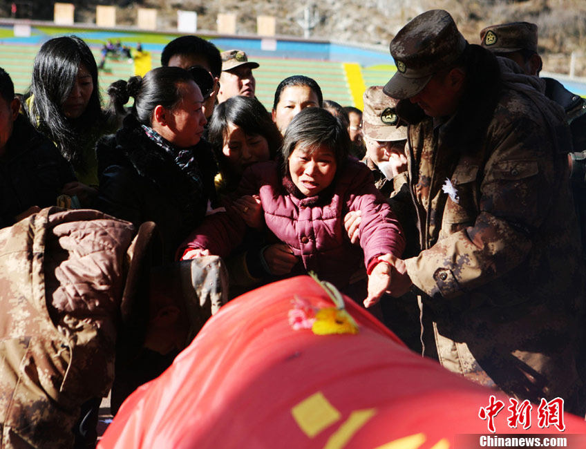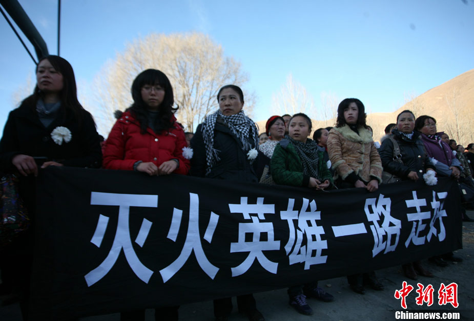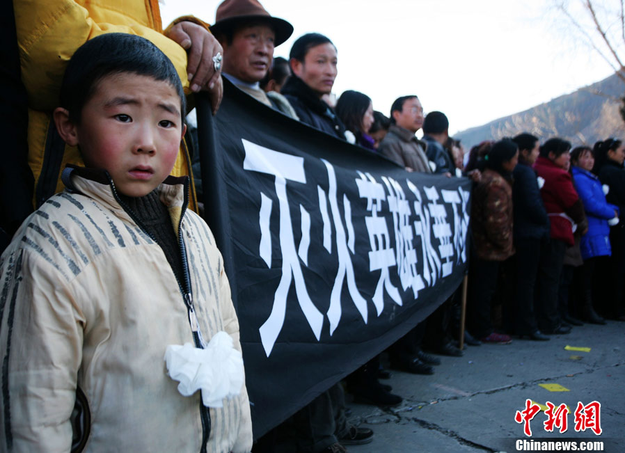 12月6日下午17時,在四川道孚救火中犧牲的15位英雄靈柩起運送往康定火化,上萬民眾胸帶白花來到英雄路過的川藏線國道317線道孚城區段送別英雄。圖為道孚縣民眾痛別英雄。 中新社發 劉忠俊 攝