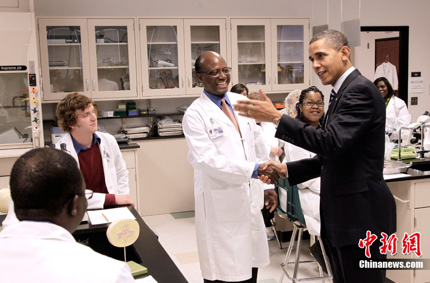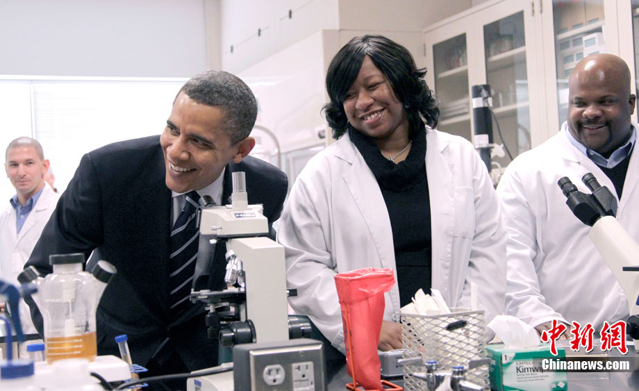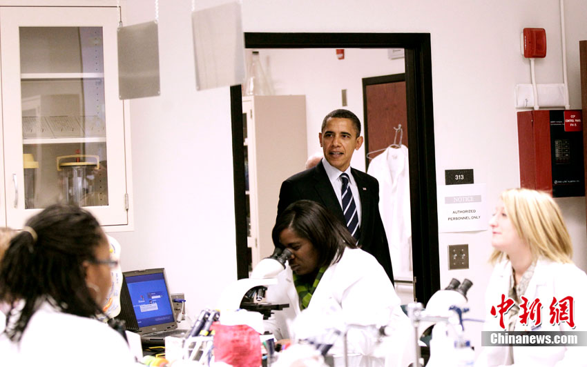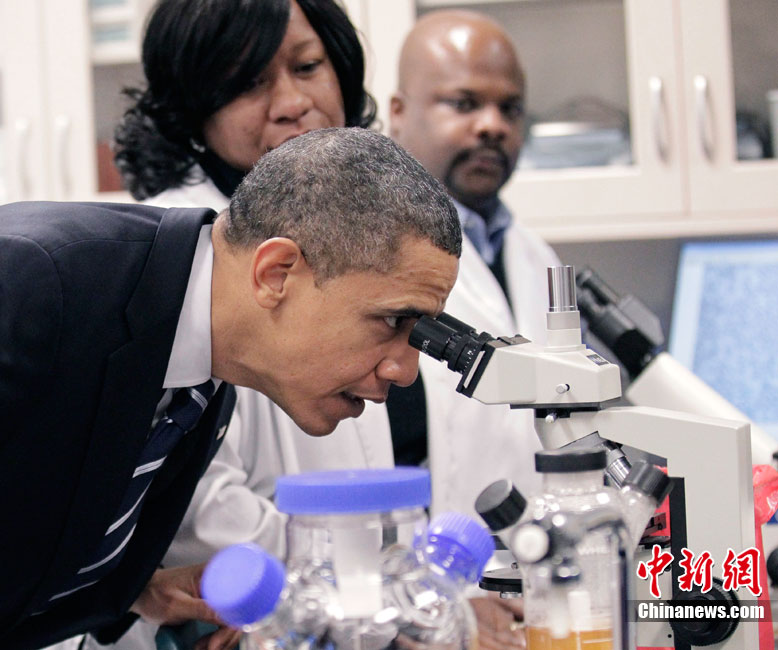 美國總統奧巴馬參觀社區大學試用顯微鏡