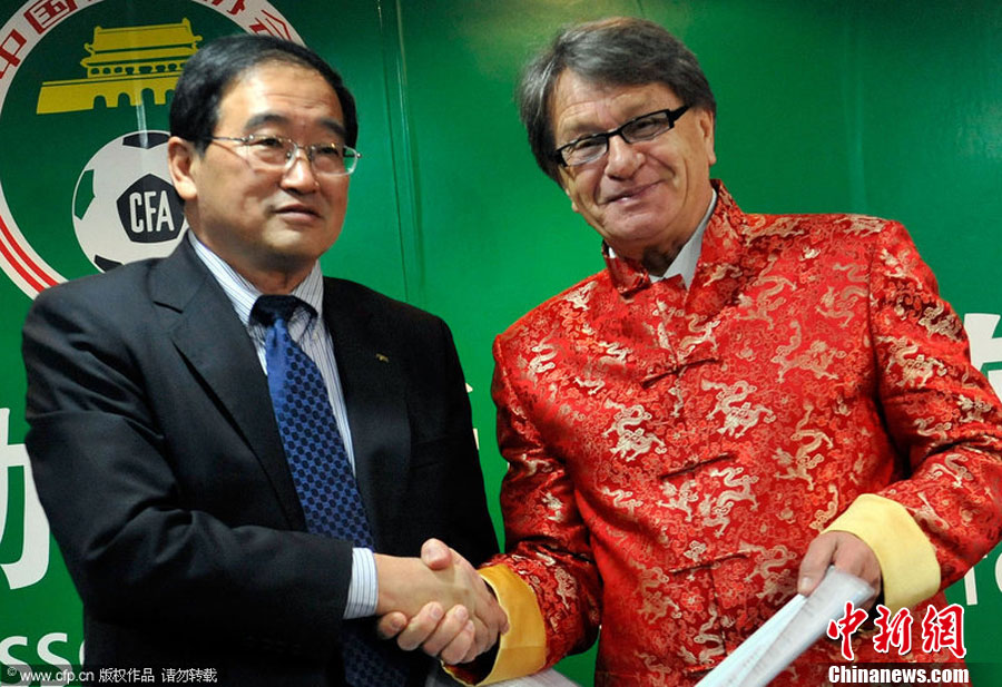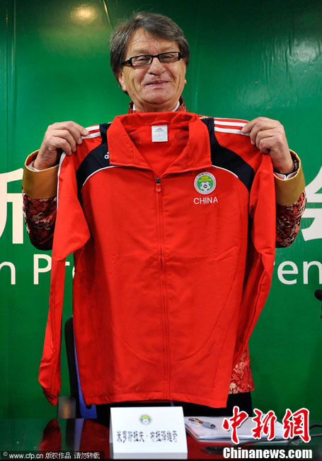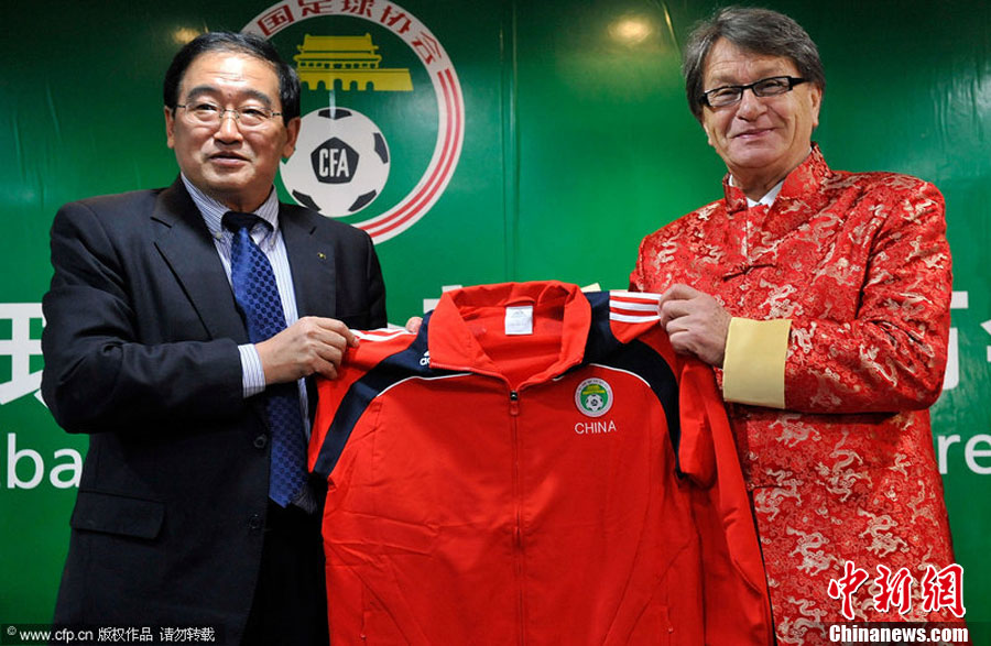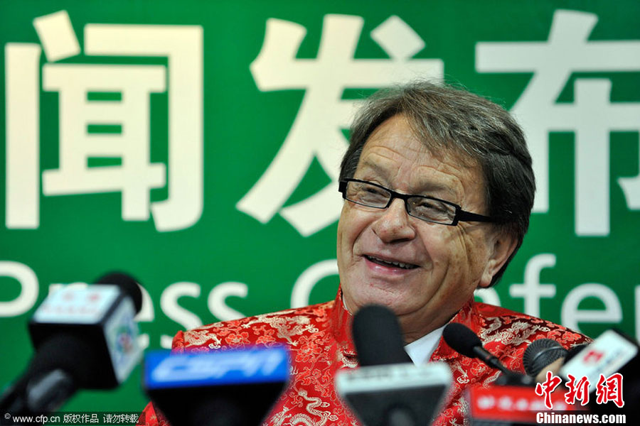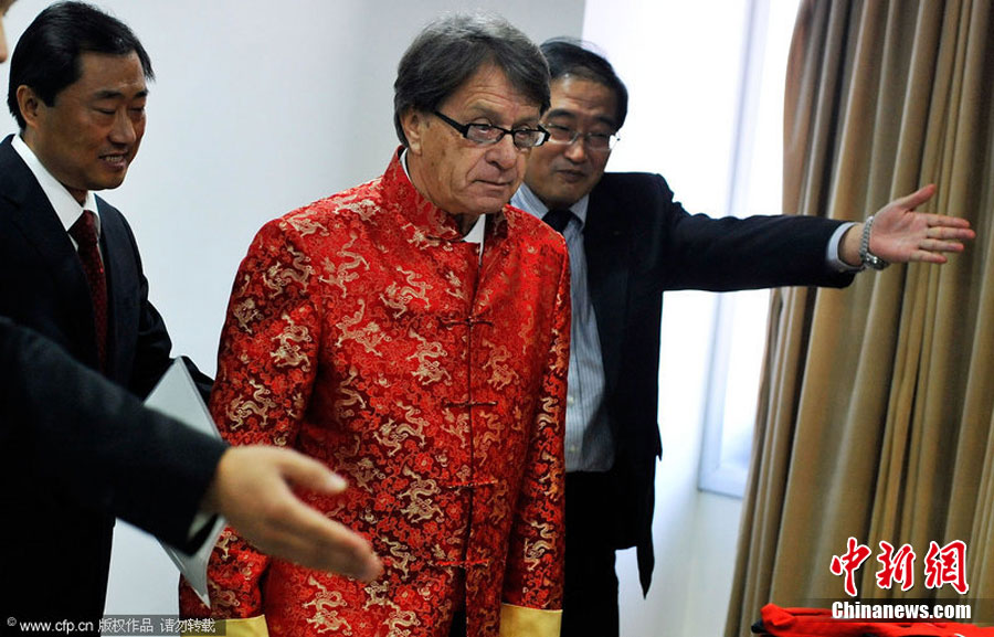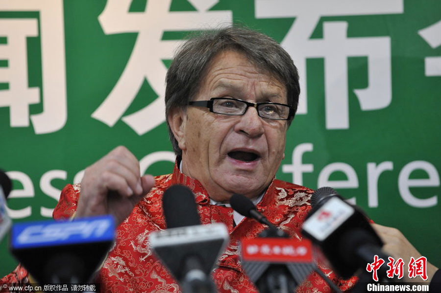 12月11日,中國北京,中國足協召開新聞發布會,前上海申花主帥布拉澤維奇正式出任國奧主帥。圖為布拉澤維奇著唐裝出席發布會。圖片來源:CFP視覺中國