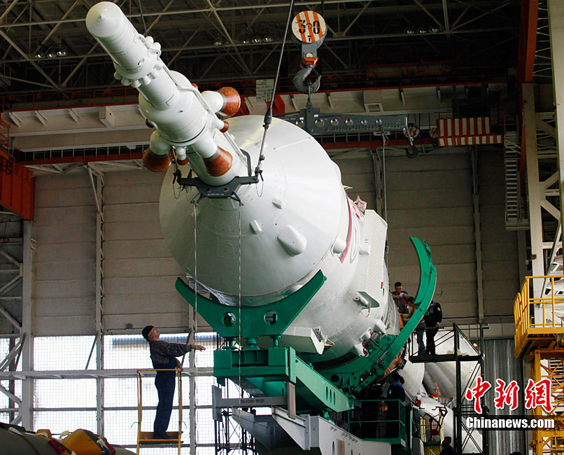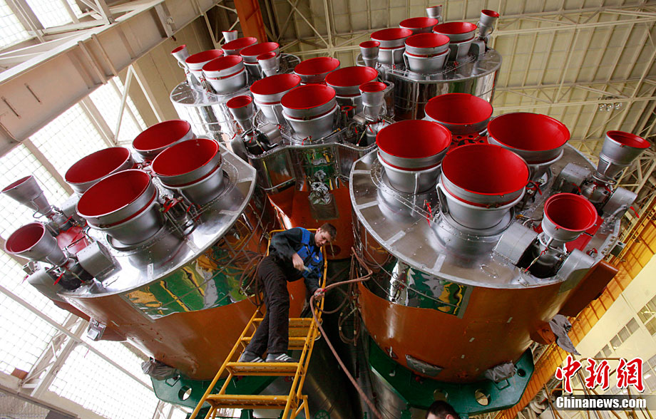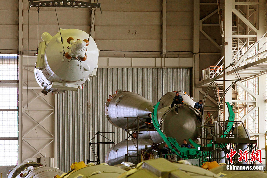 當地時間12月12日,哈薩克斯坦拜科努爾航天中心,俄羅斯聯盟TMA-20載人火箭在發射場內的裝配車間接受升空前的檢查。俄羅斯新聯盟號將在12月15日前往國際空間站。