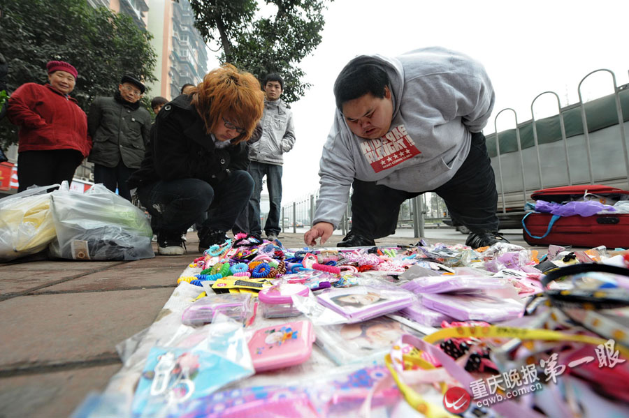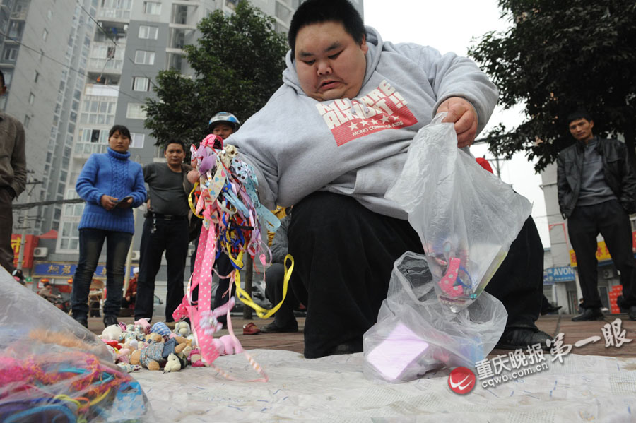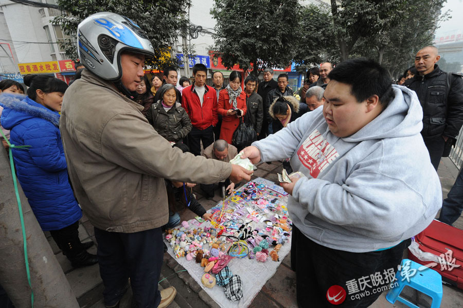“走,出去擺哈地攤,活動一下!”吃過午飯后,梁用打開病房的衣柜,提出一大包鑰匙鏈、手機鏈、耳環、頭花等小飾品。梁用的出現,猶如明星一般,“看,又是哪個胖娃!”不少人圍了過來。記者守候了半個多小時,發現大多顧客并非沖著飾品而來,而是被梁用巨大的體型吸引來的。