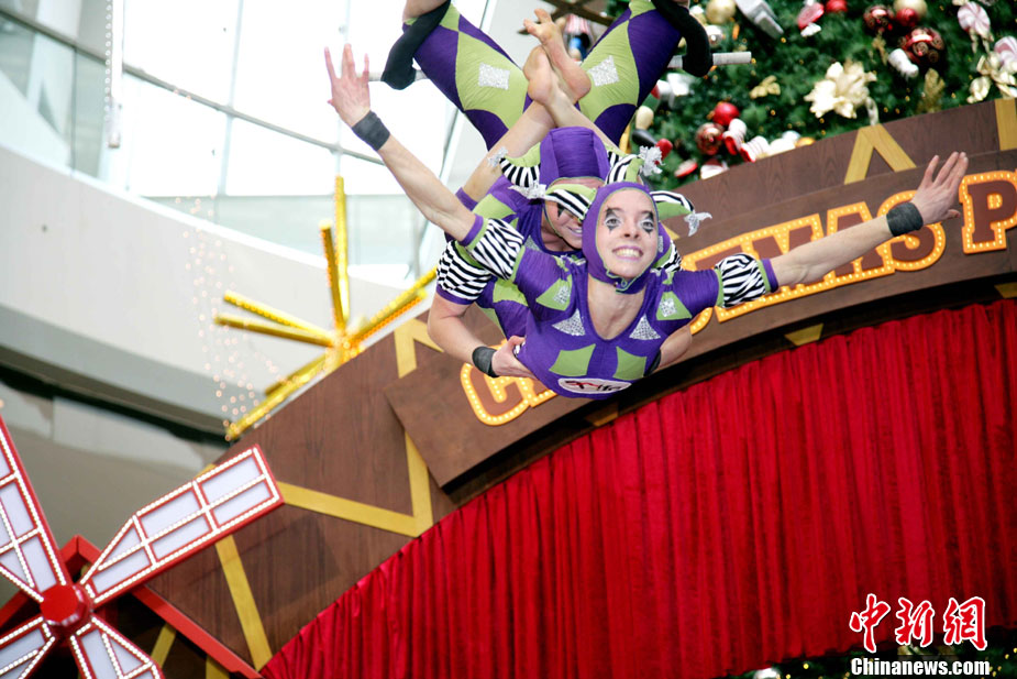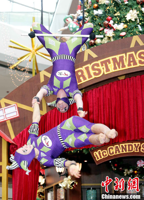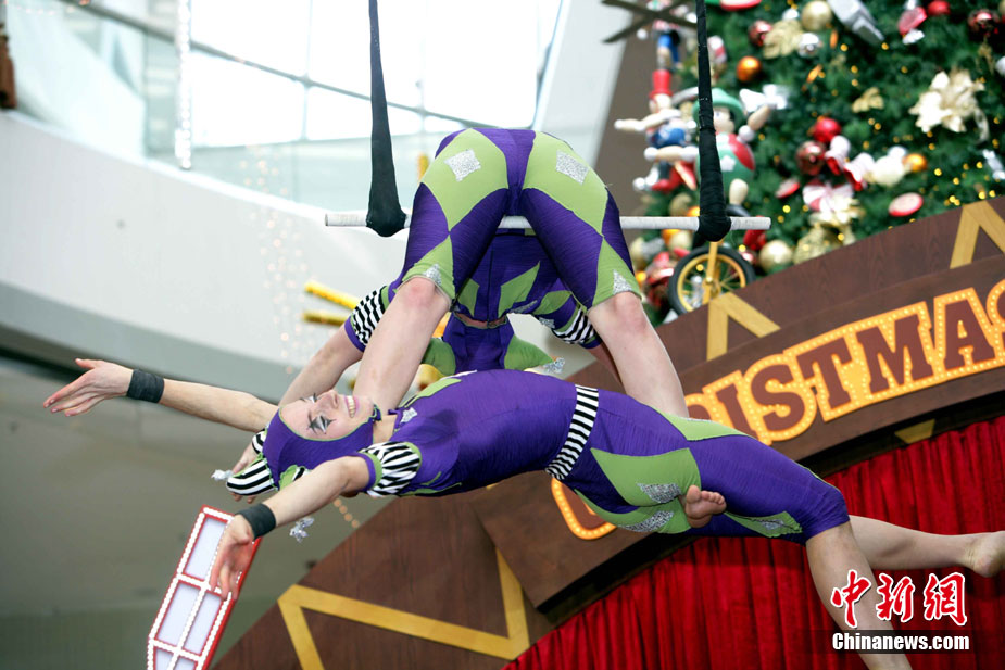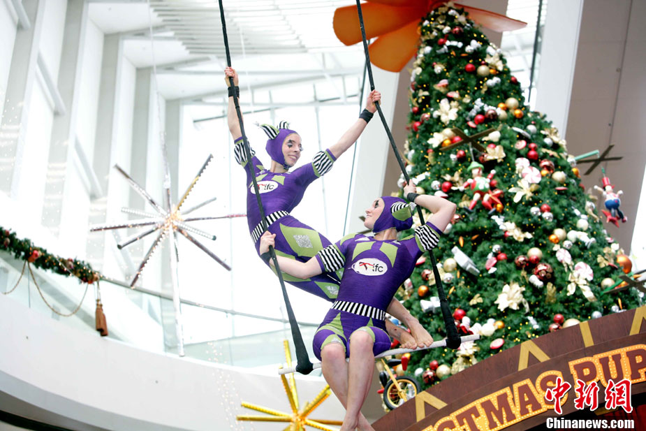 12月14日,香港國際金融中心上演震撼視覺的高空特技。首次來港獻(xiàn)藝的美國著名雜技團(tuán)D Squared Trapeze在圣誕樂園內(nèi)打造雙人空中秋千,凌空飛舞表演,帶給觀眾“飛一般”夢幻體驗(yàn)。中新社發(fā) 洪少葵 攝