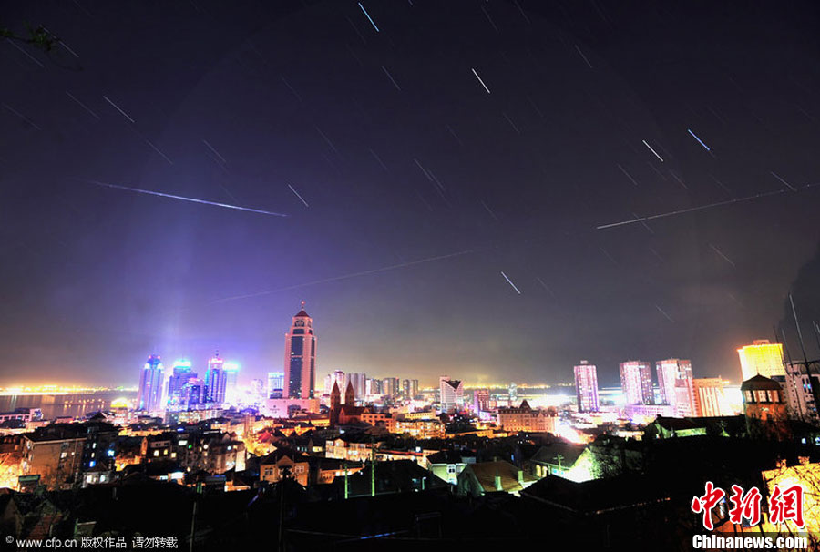 臨近歲末,雙子座流星雨如期而至。12月14日19時,雙子座流星雨達(dá)到極大,每小時流星量達(dá)120顆。圖為山東青島棧橋景區(qū)上空明亮的流星從雙子星座輻射而出,劃過城市上空。周昆 攝 圖片來源:CFP視覺中國