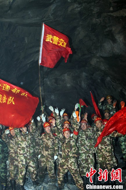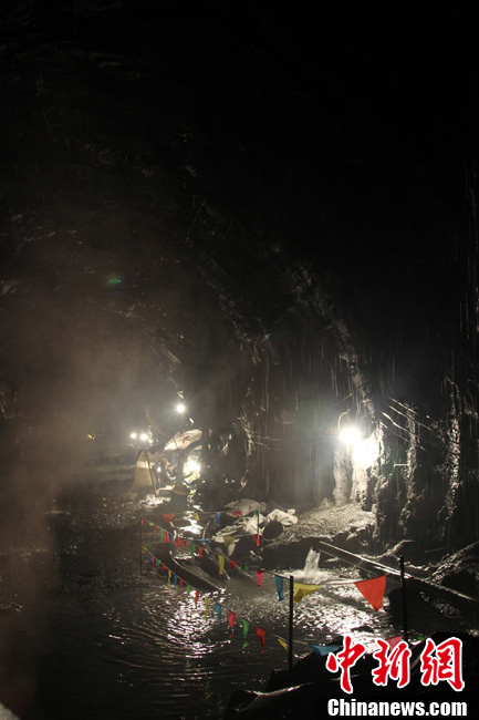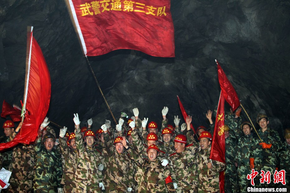 西藏墨脫公路控制性工程嘎隆拉隧道15日上午在海拔3700多米的隧道口順利貫通。墨脫人民世代被茫茫雪山所阻隔的歷史終于結(jié)束。隧道貫通后,參建者在貫通處歡呼。中新社記者 徐長(zhǎng)安 攝