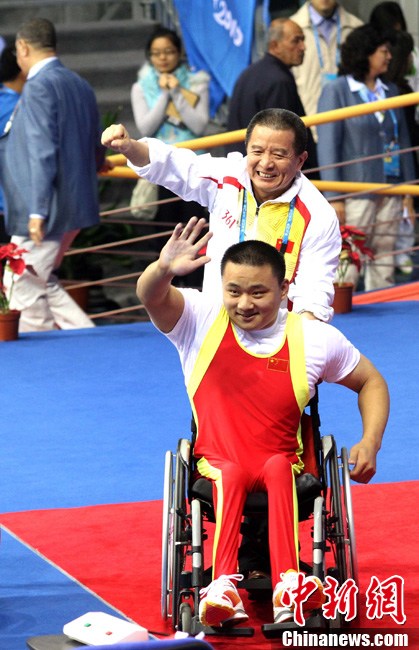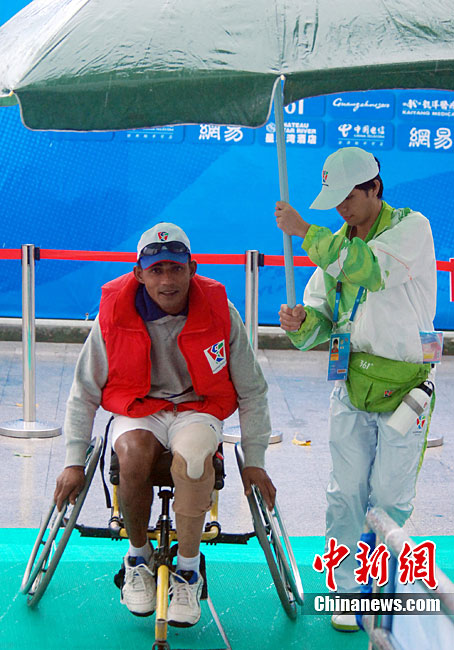 12月15日,志愿者雨天為運動員撐傘護航,無微不至。廣州2010亞殘運會,輪椅網球比賽在廣州天河體育中心網球學校舉行,因雨比賽從室外轉向室內。尹雪峰 攝