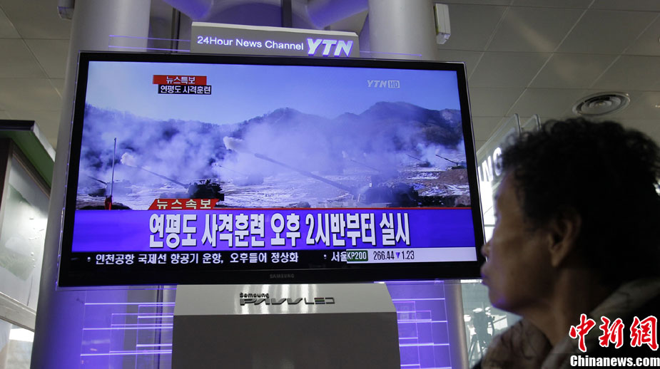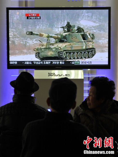 12月20日,韓國軍方開始在延坪島舉行海上實彈射擊訓練。圖為韓國民眾在電視上收看演習訓練的新聞。