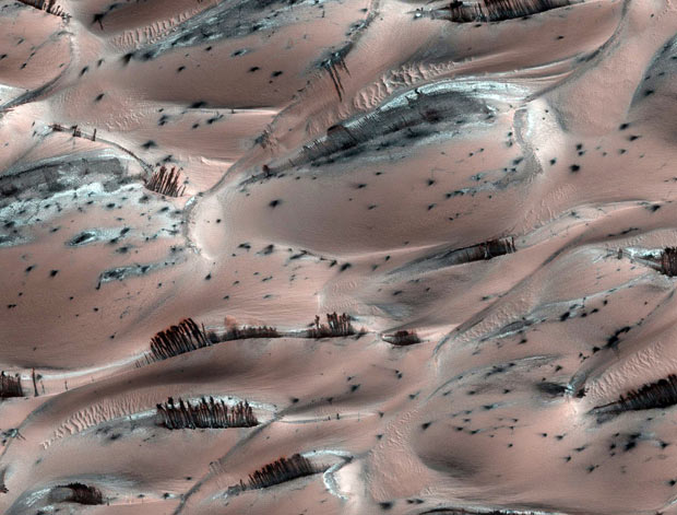 美國宇航局“火星偵察軌道器”在火星“阿拉比亞陸地平原”地區,拍攝到的奇怪隕石彈坑。自從2006年以來,“火星偵察軌道器”已經發回100兆兆位的信息,相當于MP3中存了300萬首歌。