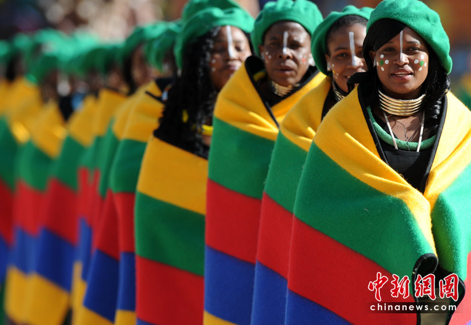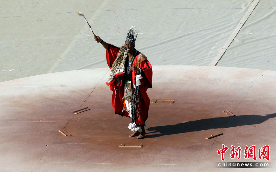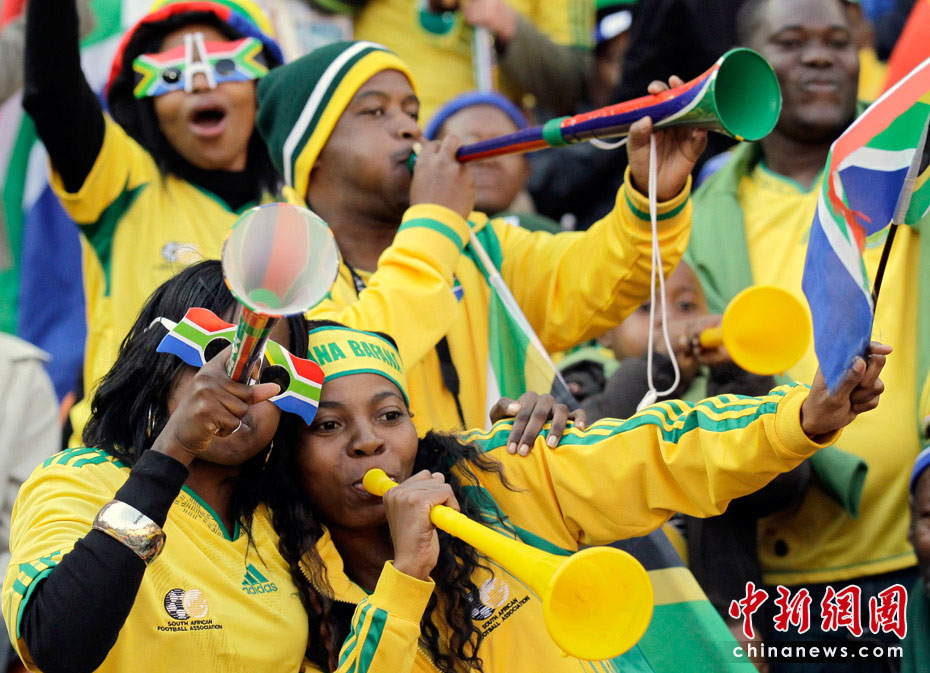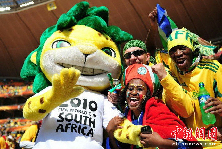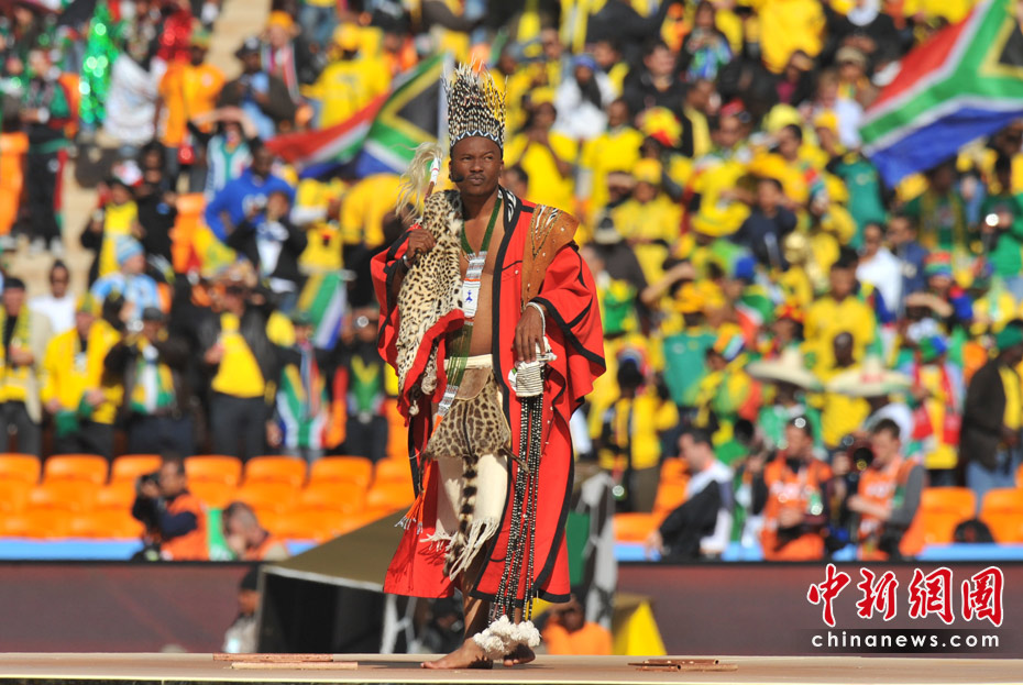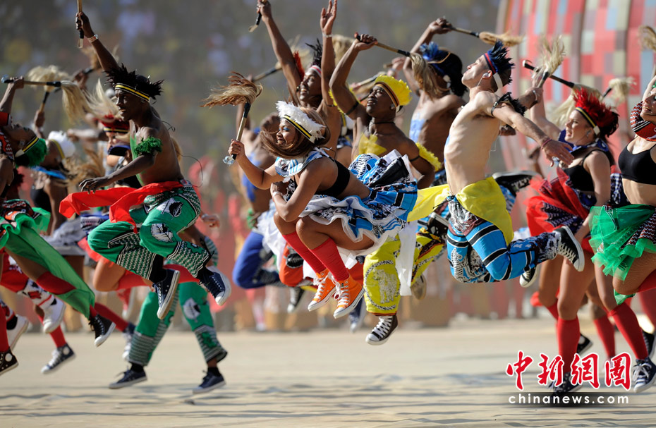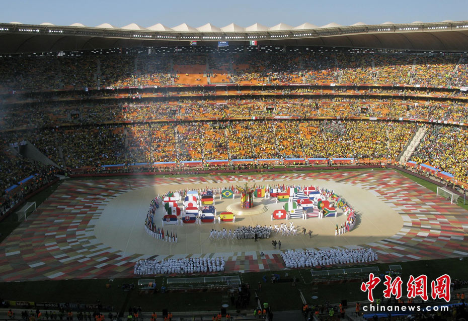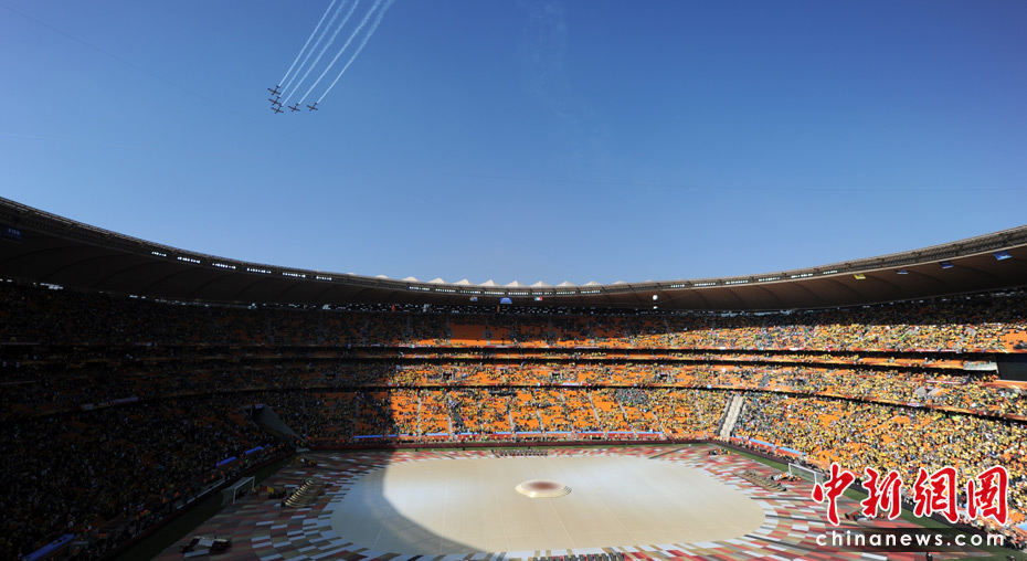 北京時間11日晚8時10分,南非世界杯足球賽開幕儀式在約翰內斯堡的足球城體育場拉開帷幕。開幕儀式前,南非共和國的空軍進行了飛行表演。五架飛機在世界杯賽場滑翔而過。
