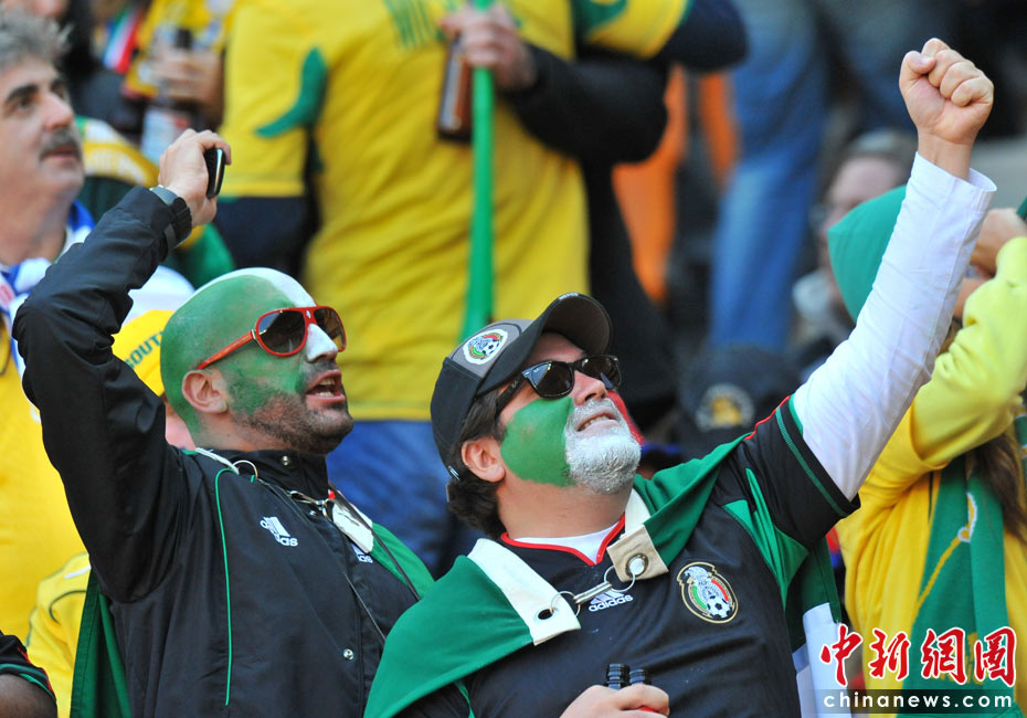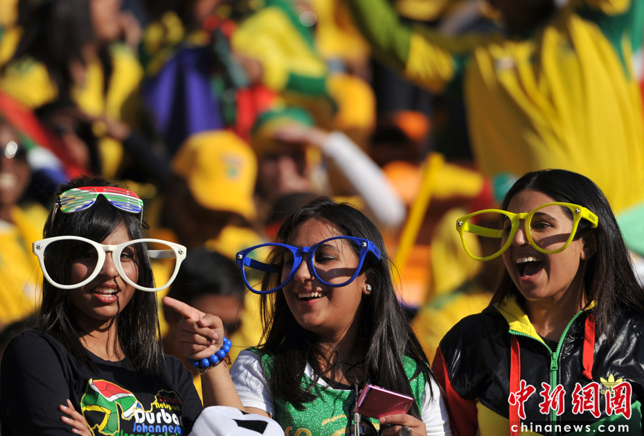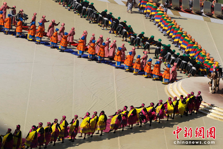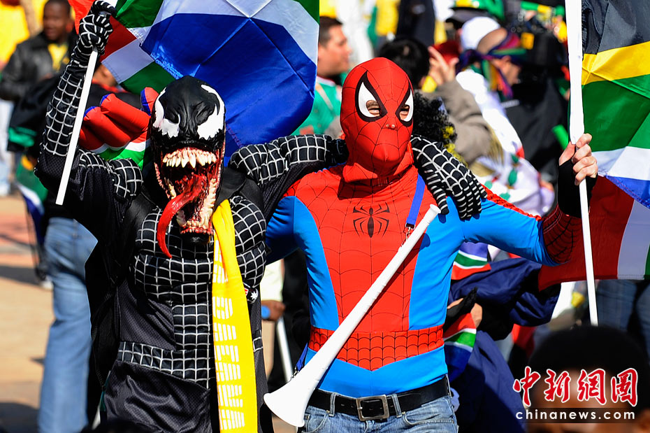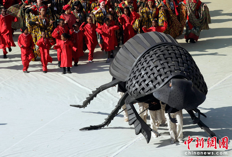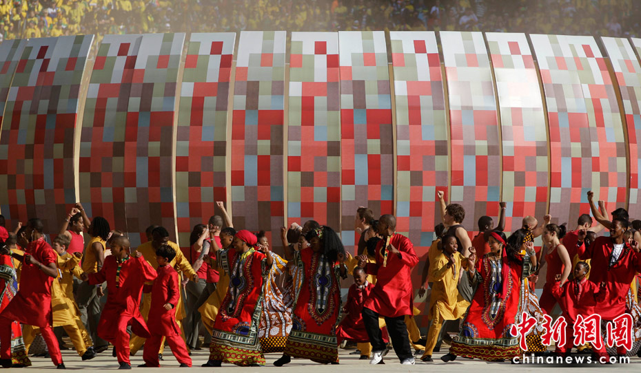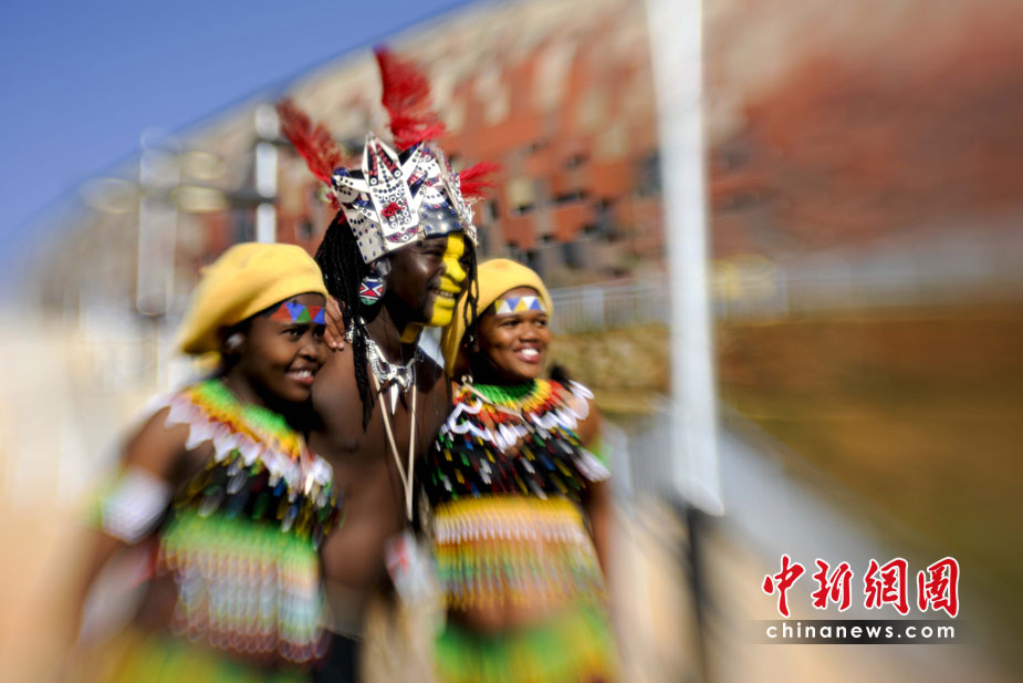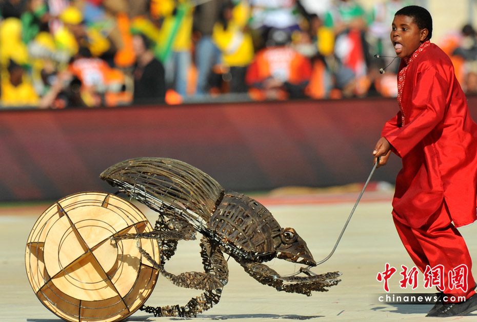 北京時間11日晚8時10分,南非世界杯足球賽開幕儀式在約翰內斯堡的足球城體育場拉開帷幕。開幕儀式前,南非共和國的空軍進行了飛行表演。五架飛機在世界杯賽場滑翔而過。