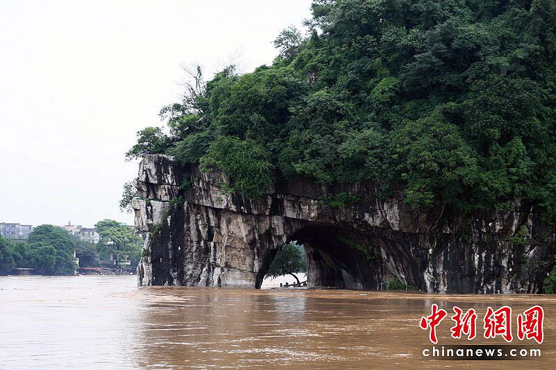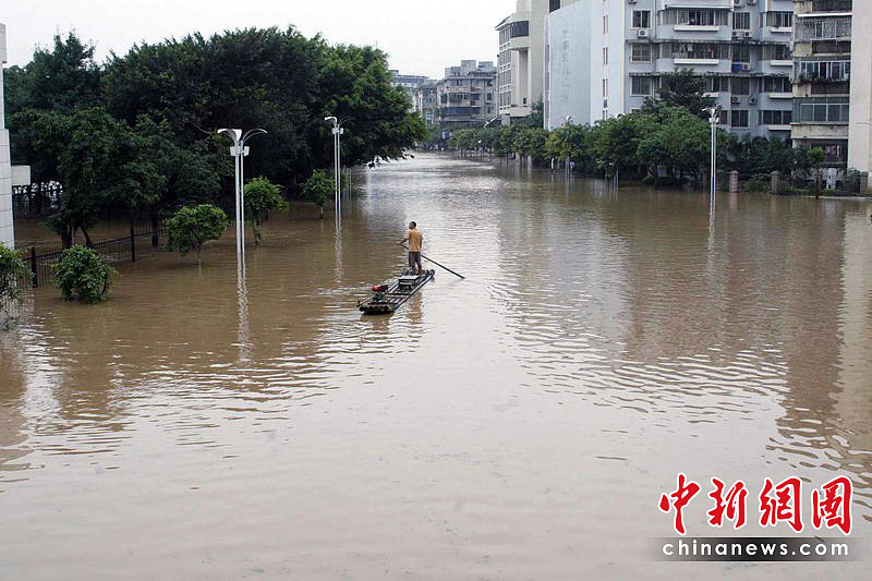 2010年6月17日,廣西桂林市出現大到暴雨、局部大暴雨天氣。漓江洪水倒流入市區,市民坐竹排出行。東華/CFP