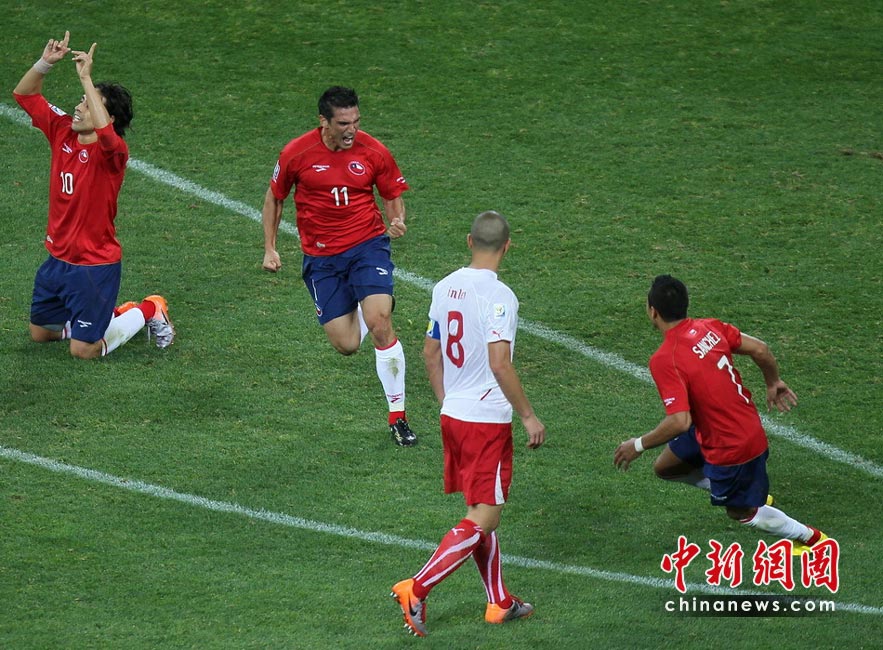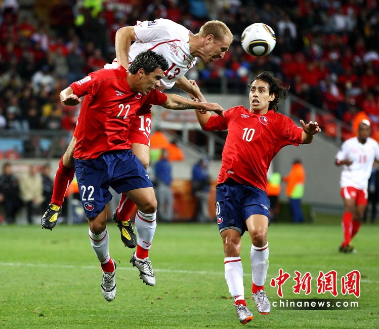 6月21日,世界杯H組第2輪首戰在伊麗莎白港納爾遜-曼德拉灣球場展開較量。瑞士中場貝赫拉米連續肘擊兩人,被紅牌罰下后,以十人應戰的他們在下半場被智利隊岡薩雷斯打入一球,以0-1告負。
