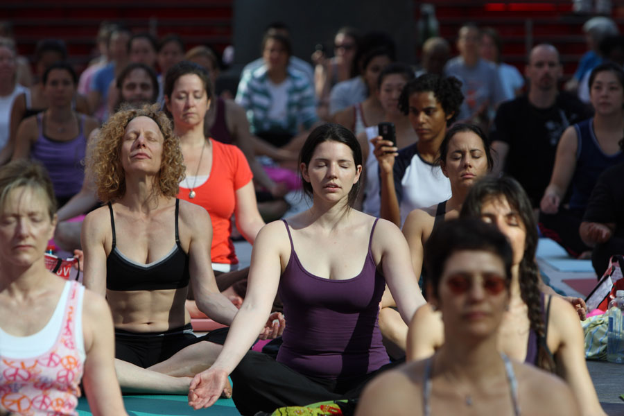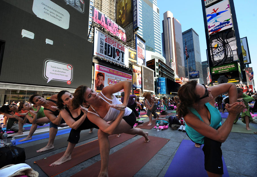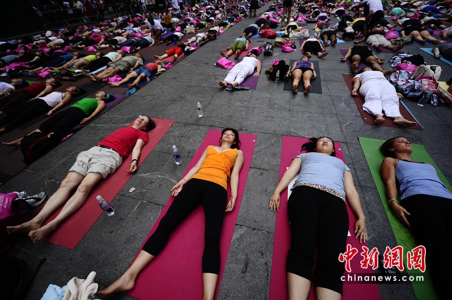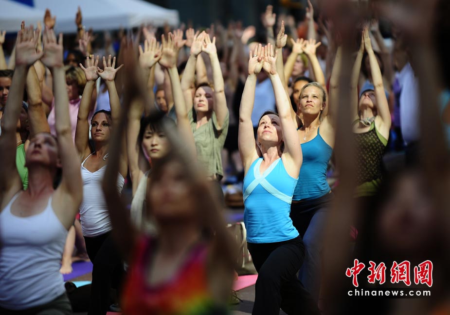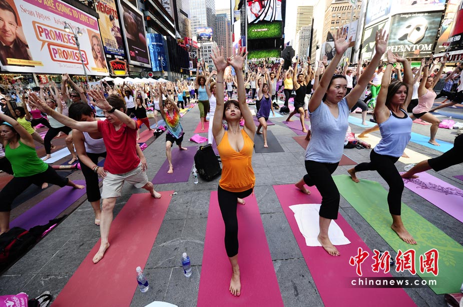 6月21日,數千瑜伽愛好者在美國紐約時報廣場用集體瑜伽的方式迎接夏至的到來。