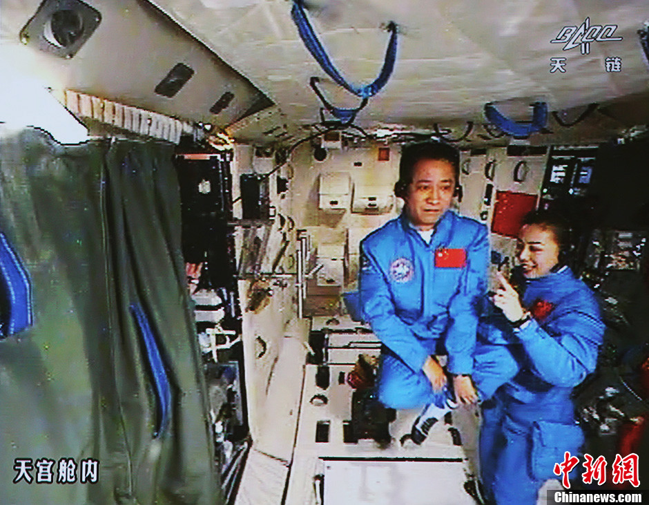 6月20日10時許,神舟十號航天員在天宮一號開展基礎物理實驗,為青少年進行中國首次太空授課。圖為講授失重狀態,聶海勝表演“懸空打坐”。中新社發 秦憲安 攝