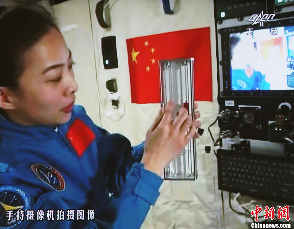 6月20日10時許,神舟十號航天員在天宮一號開展基礎物理實驗,為青少年進行中國首次太空授課。圖為王亞平講授質量測量。中新社發(fā) 秦憲安 攝