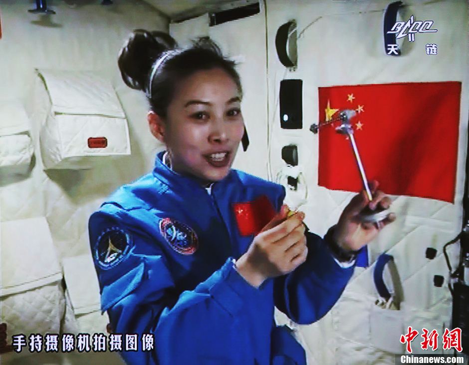 6月20日10時許,神舟十號航天員在天宮一號開展基礎物理實驗,為青少年進行中國首次太空授課。圖為王亞平講授太空失重提供條件下的單擺演示。中新社發 秦憲安 攝