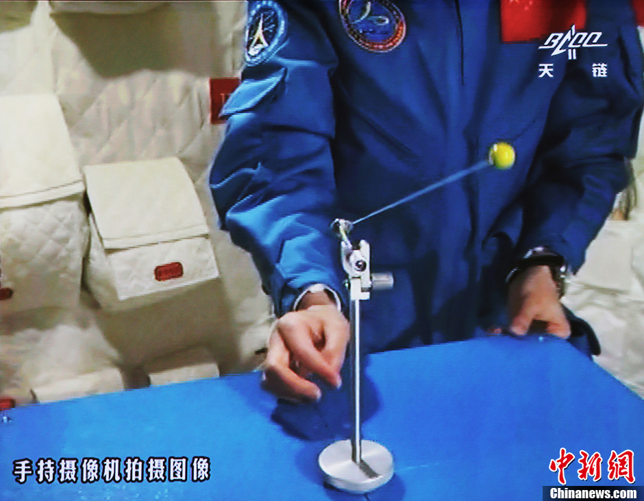 6月20日10時許,神舟十號航天員在天宮一號開展基礎物理實驗,為青少年進行中國首次太空授課。圖為王亞平講授太空失重提供條件下的單擺演示。中新社發 秦憲安 攝